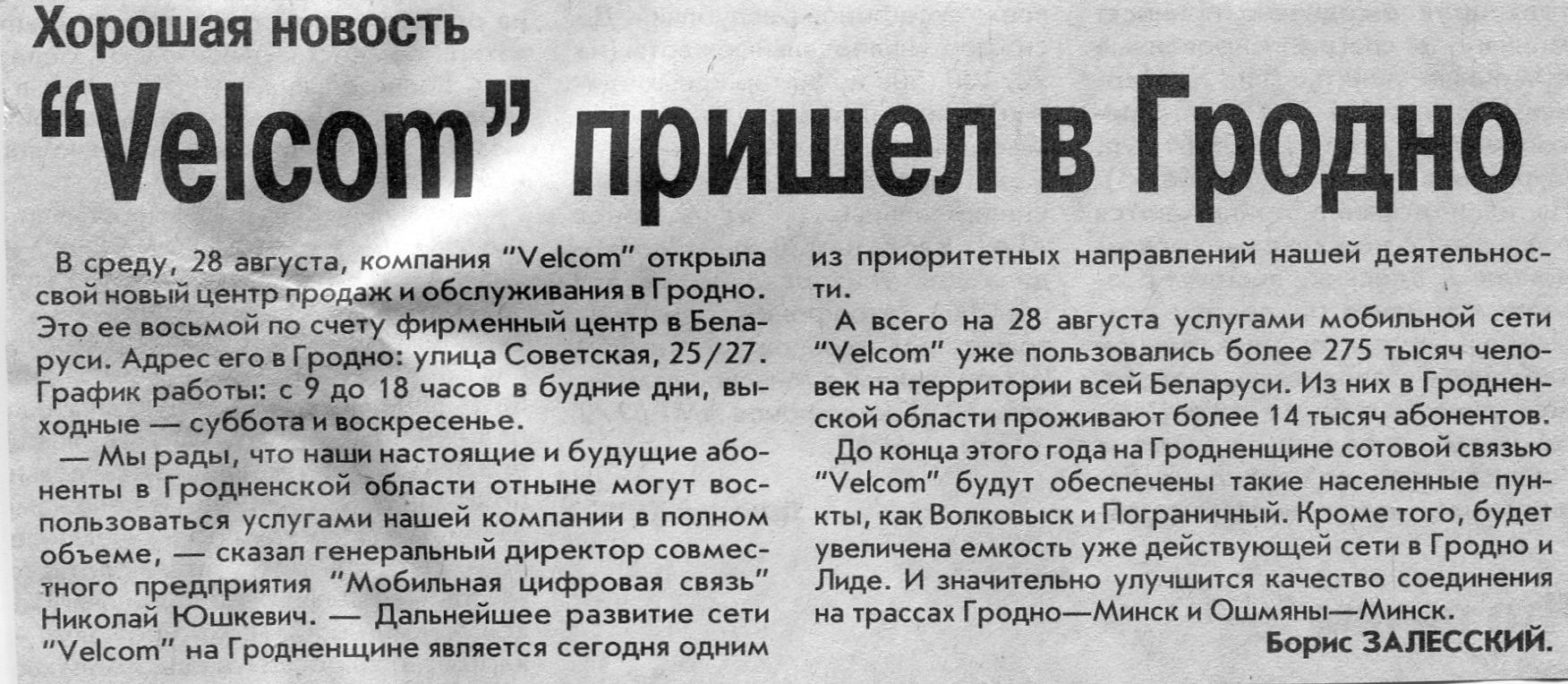 Залесский, Б. "Velcom" пришел в Гродно / Б. Залесский // Вечерний Минск. - 2002. - 29 авг.
