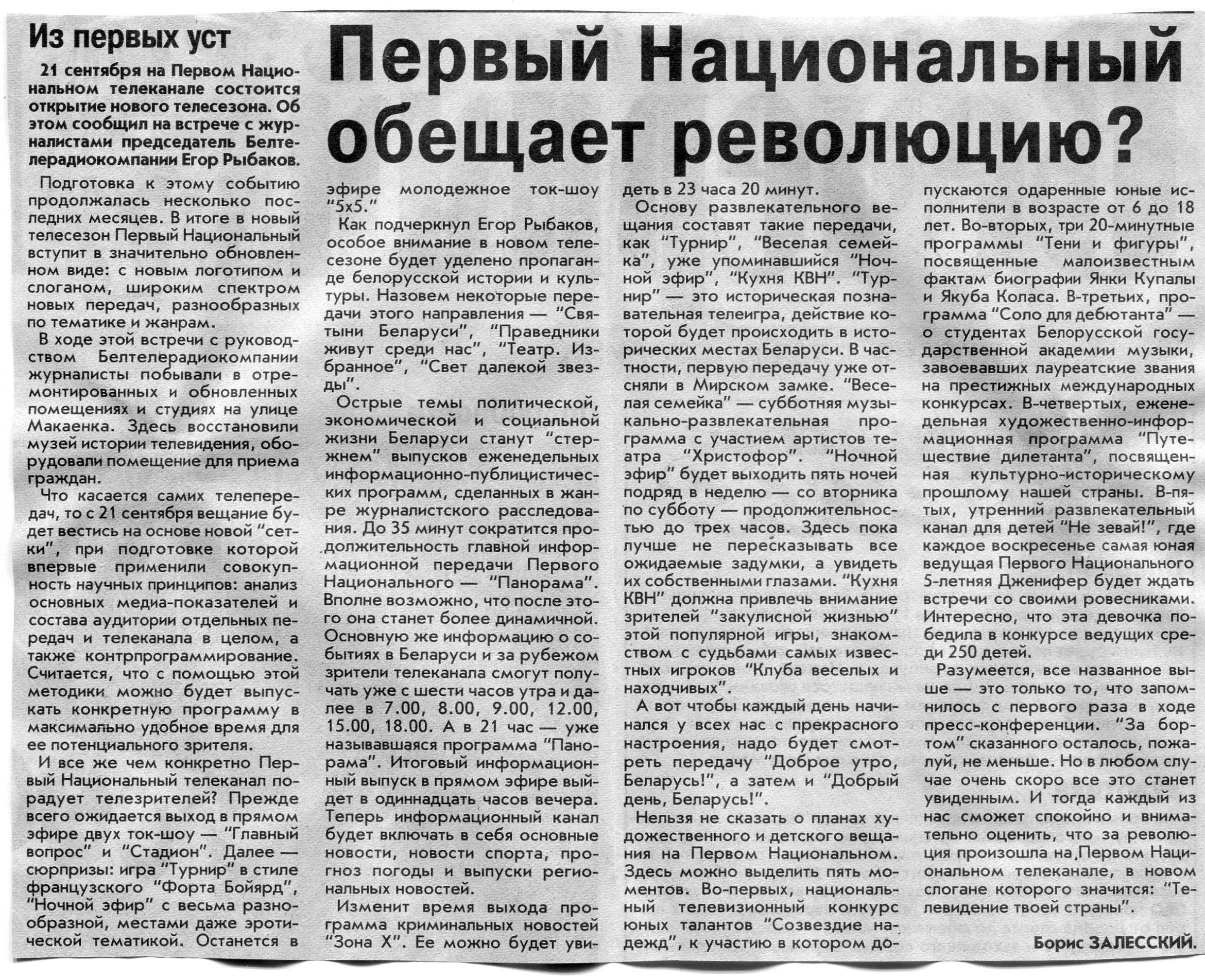 Залесский, Б. Первый Национальный обещает революцию? / Б. Залесский // Вечерний Минск. - 2002. - 10 сент.