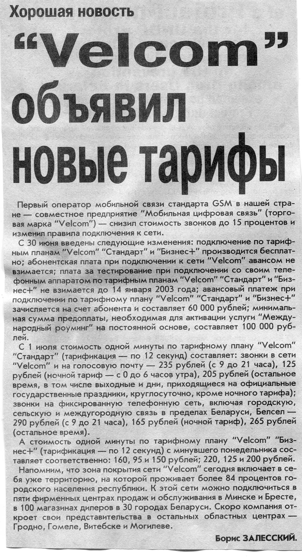 Залесский, Б. "Velcom" объявил новые тарифы / Б. Залесский // Вечерний Минск. - 2002. - 5 июл.