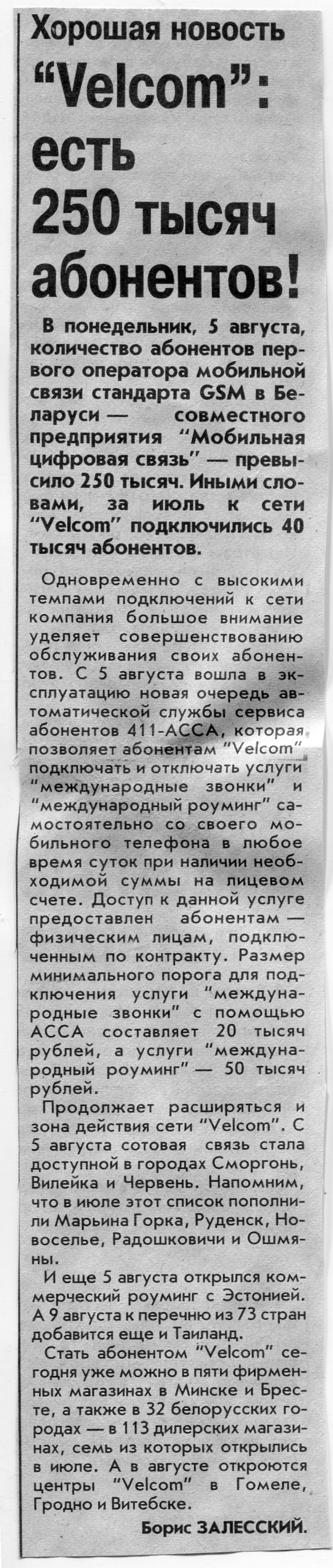 Залесский, Б. "Velcom": есть 250 тысяч абонентов! / Б. Залесский // Вечерний Минск. - 2002. - 7 авг.
