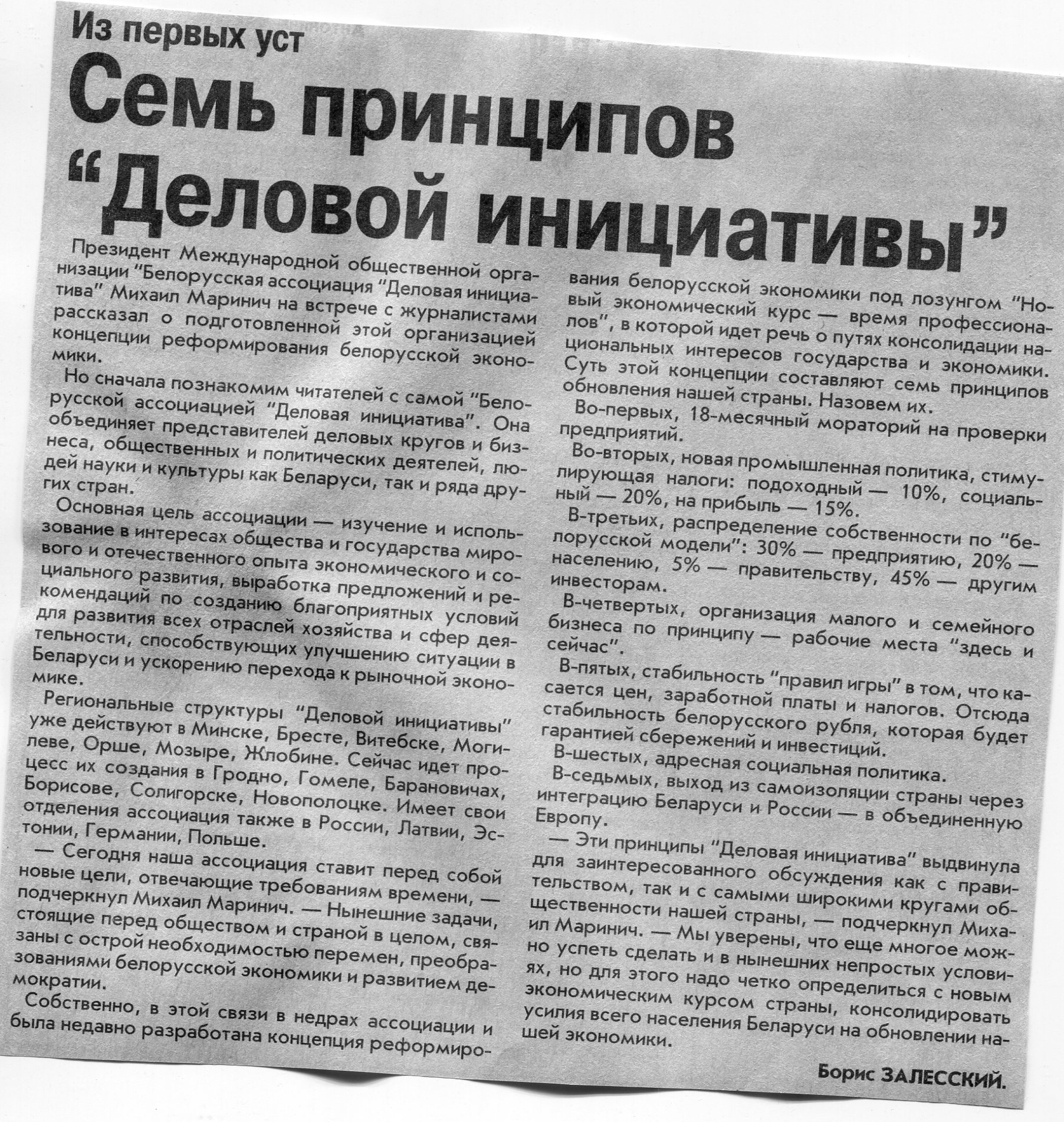 Залесский, Б. Семь принципов "Деловой инициативы" / Б. Залесский // Вечерний Минск. - 2002. - 10 июл.