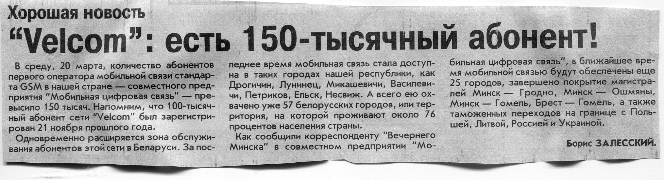 Залесский, Б. "Velcom": есть 150-тысячный абонент! / Б. Залесский // Вечерний Минск. - 2002. - 25 мар.