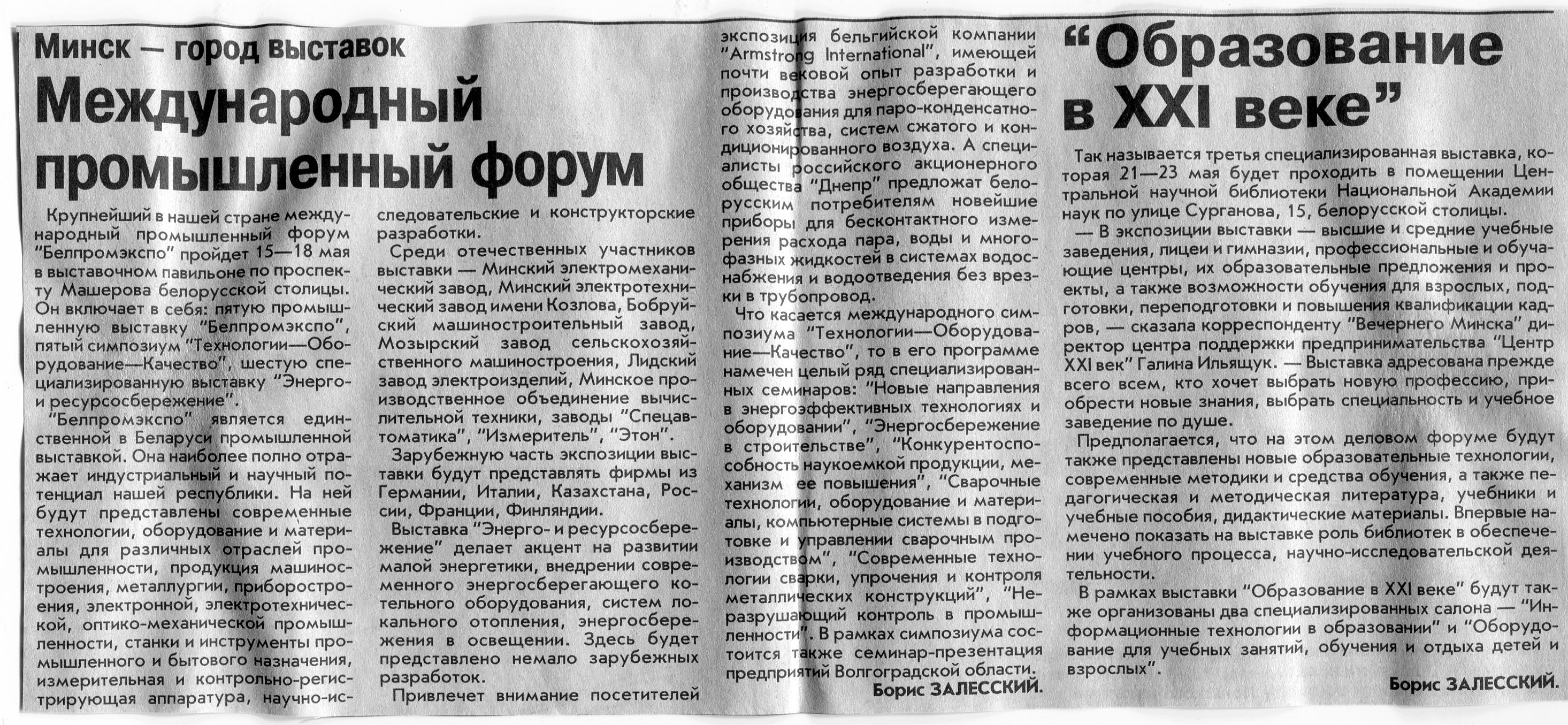 Залесский, Б. Международный промышленный форум / Б. Залесский // Вечерний Минск. - 2002. - 7 мая.