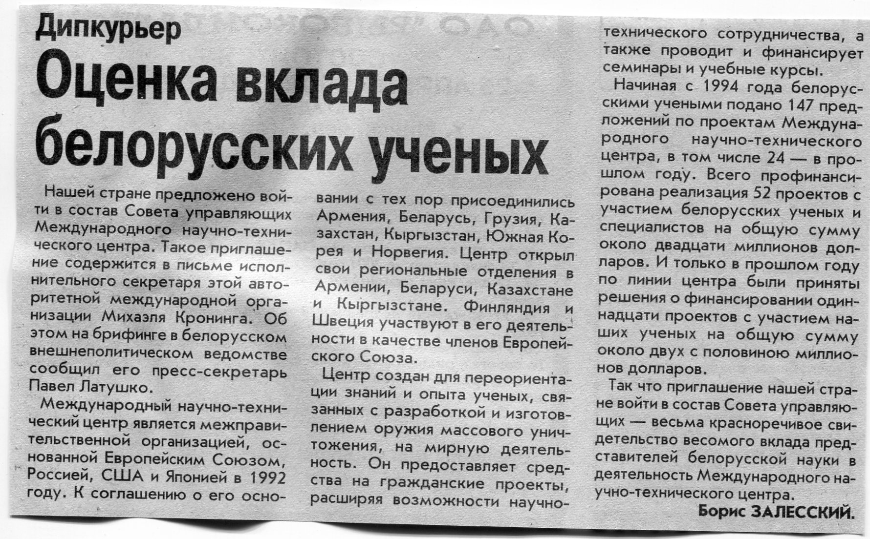 Залесский, Б. Оценка вклада белорусских ученых / Б. Залесский // Вечерний Минск. - 2002. - 21 мар.