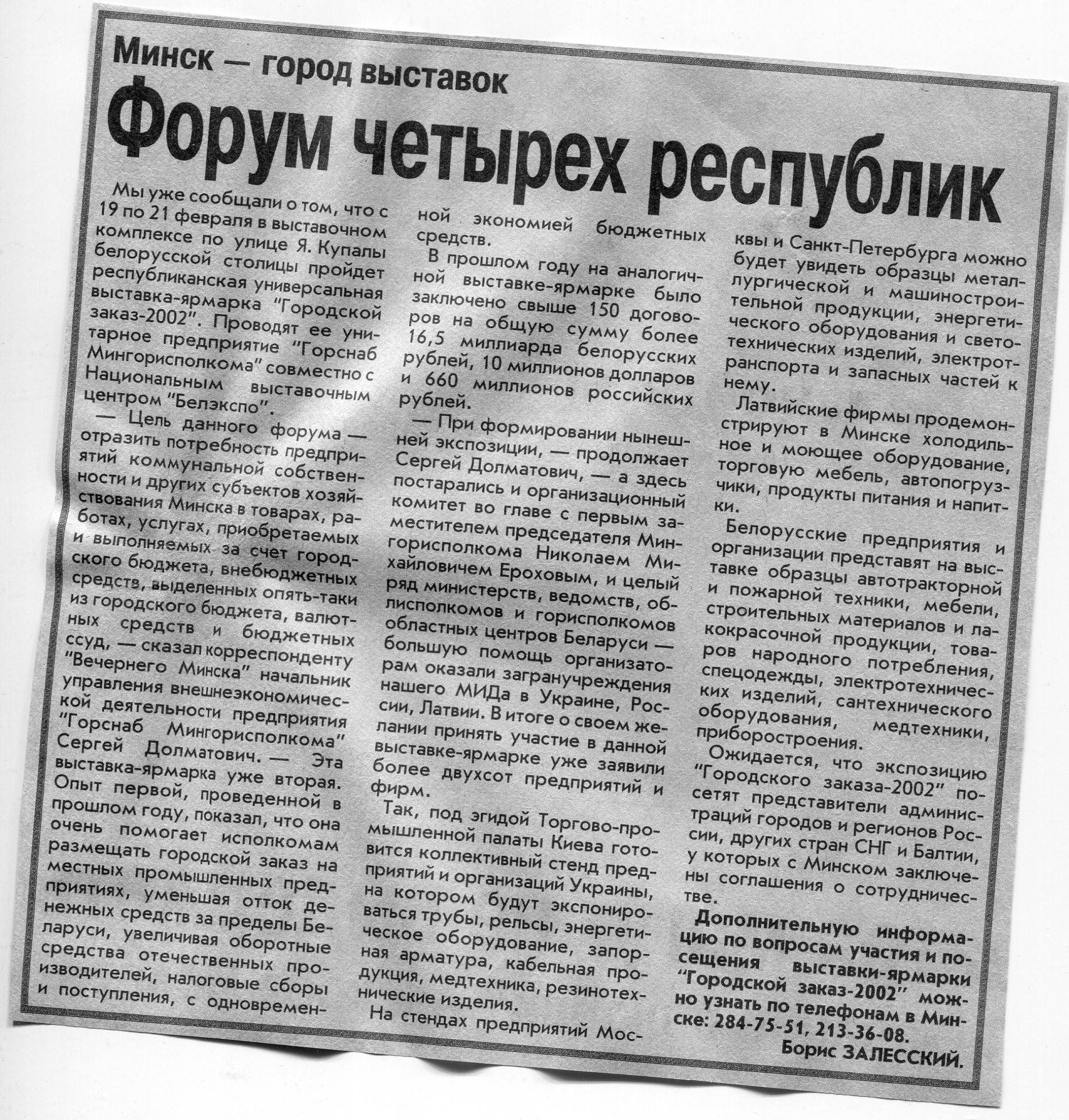 Залесский, Б. Форум четырех республик / Б. Залесский // Вечерний Минск. - 2002. - 12 февр.