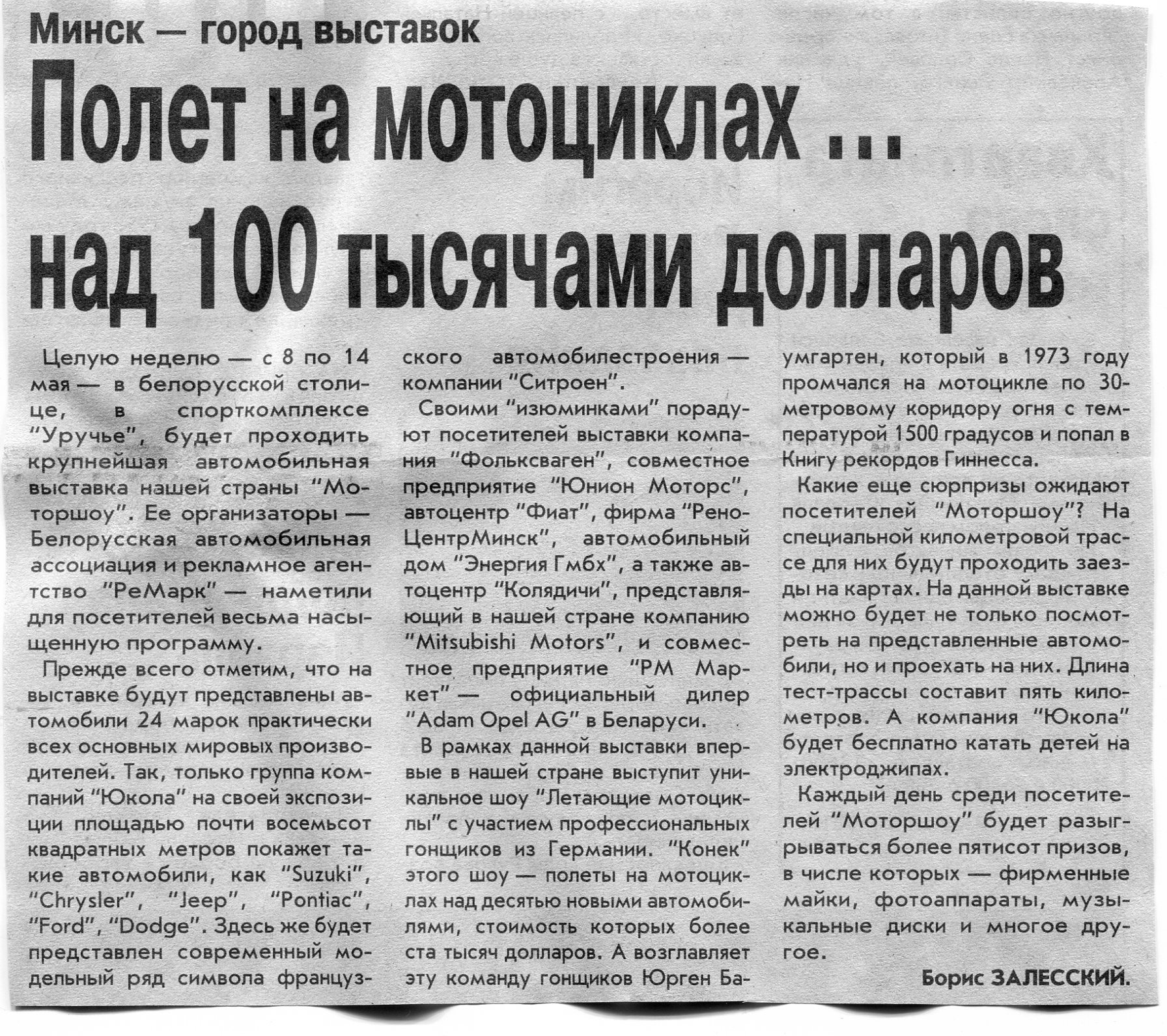 Залесский, Б. Полет на мотоциклах ... над 100 тысячами долларов / Б. Залесский // Вечерний Минск. - 2002. - 6 мая.