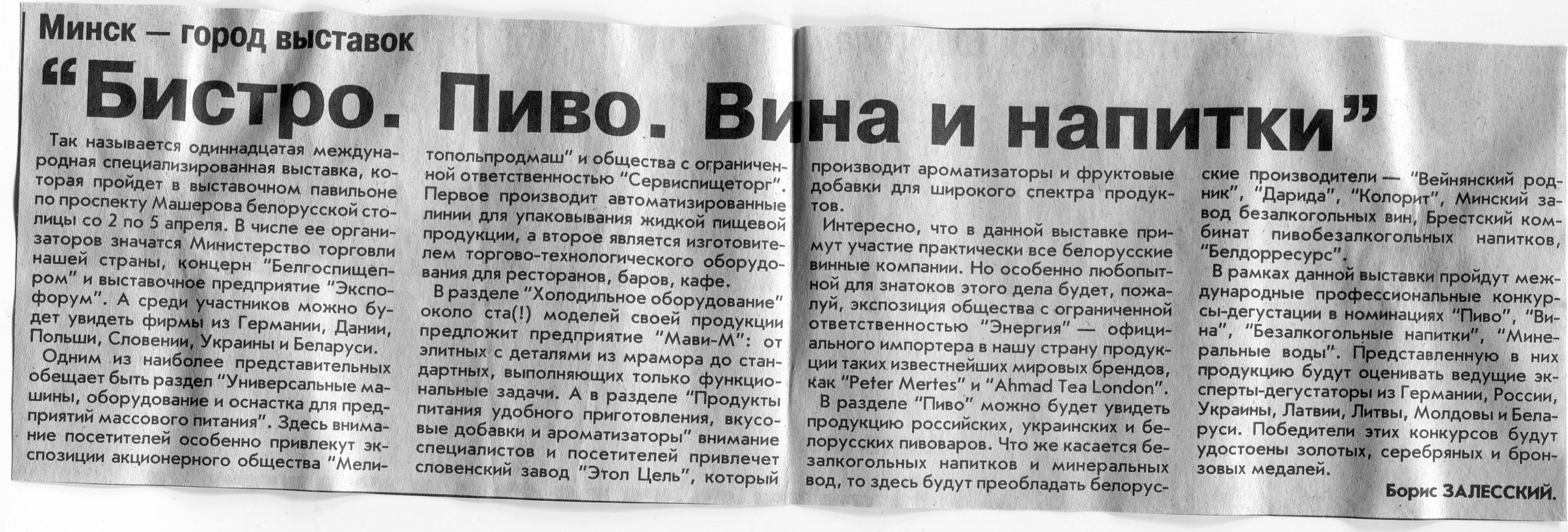Залесский, Б. "Бистро. Пиво. Вина и напитки" / Б. Залесский // Вечерний Минск. - 2002. - 28 мар.