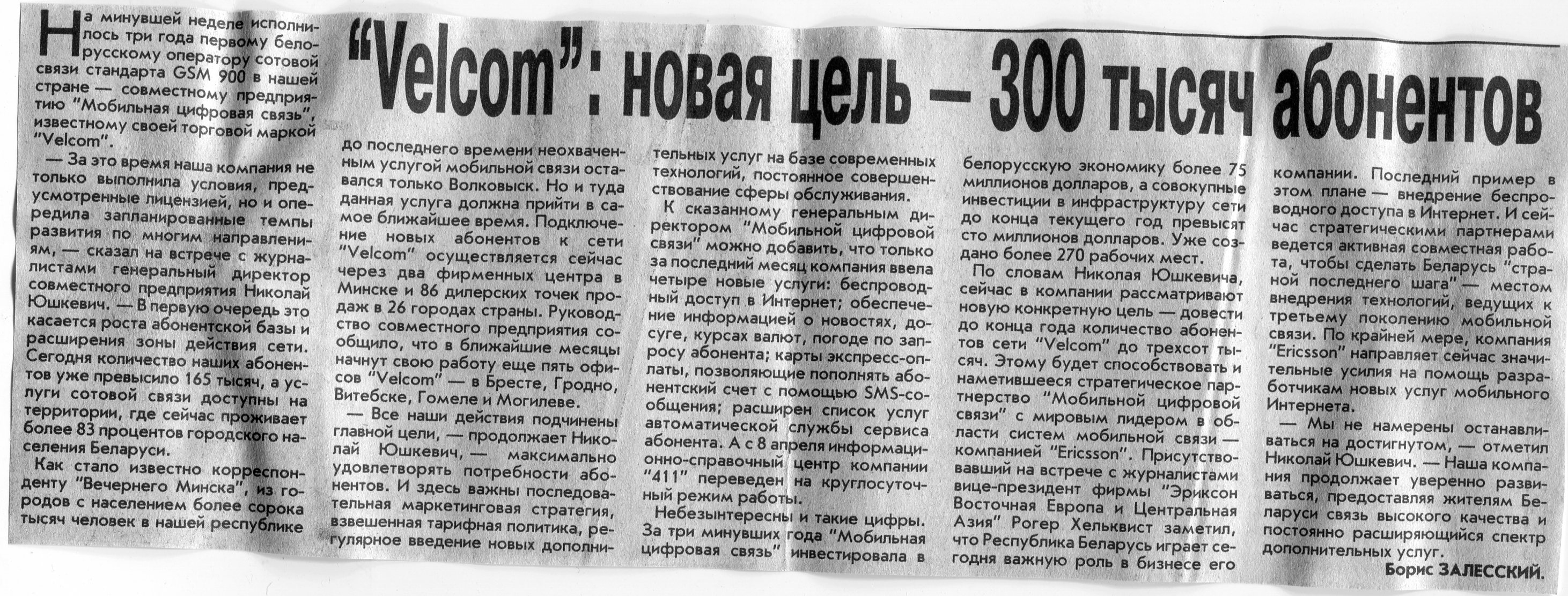 Залесский, Б. "Velcom": новая цель - 300 тысяч абонентов / Б. Залесский // Вечерний Минск. - 2002. - 22 апр.