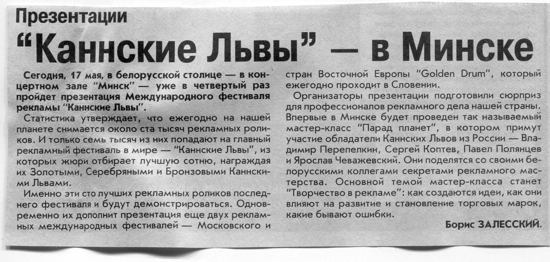 Залесский, Б. "Каннские Львы" - в Минске / Б. Залесский // Вечерний Минск. - 2002. - 17 мая.