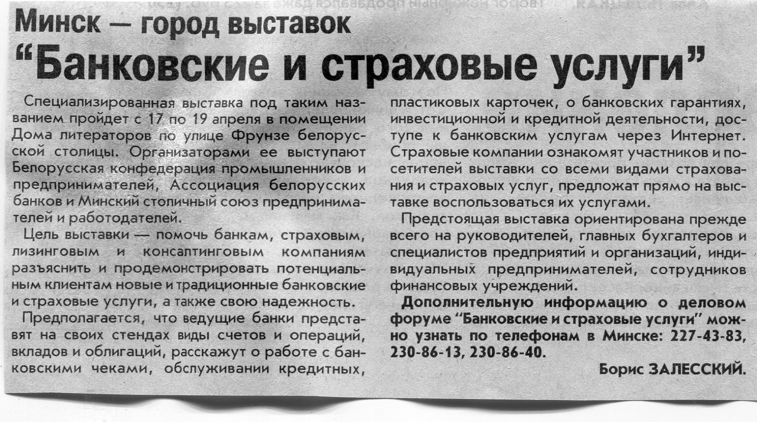 Залесский, Б. "Банковские и страховые услуги" / Б. Залесский // Вечерний Минск. - 2002. - 11 апр.