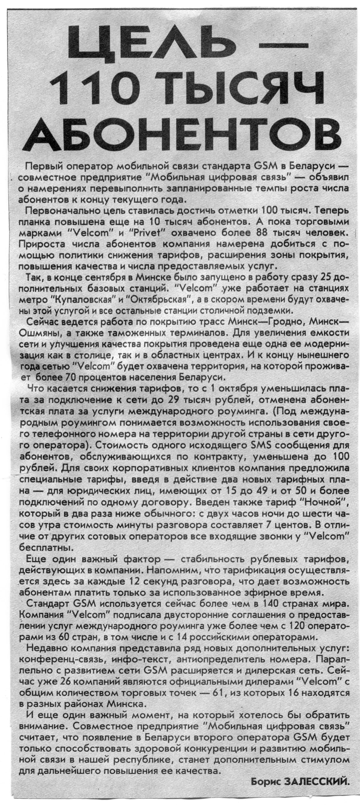 Залесский, Б. Цель - 110 тысяч абонентов / Б. Залесский // Вечерний Минск. - 2001. - 24 окт.