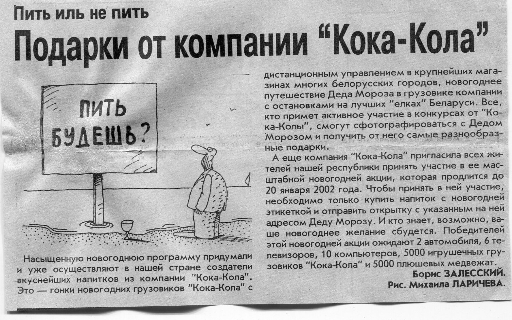 Залесский, Б. Подарки от компании "Кока-Кола" / Б. Залесский // Вечерний Минск. - 2001. - 28 дек.