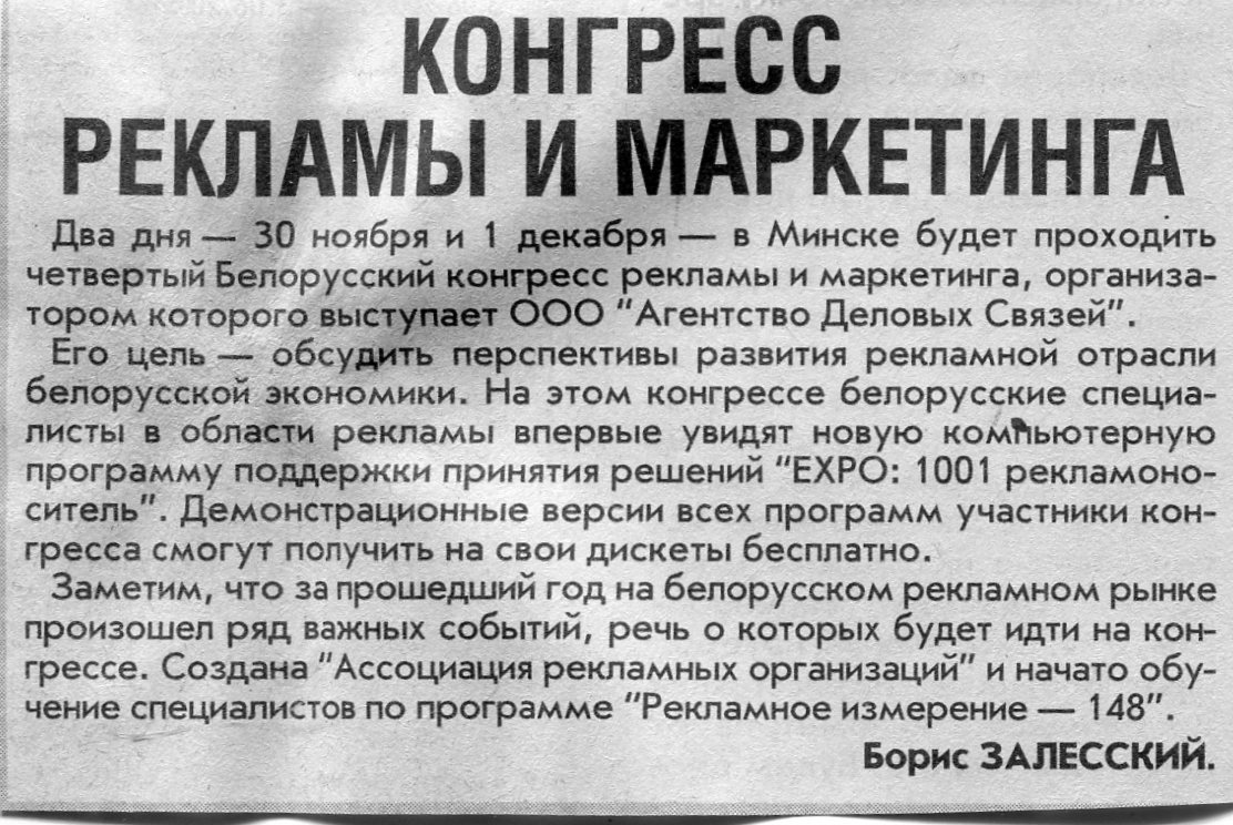 Залесский, Б. Конгресс рекламы и маркетинга / Б. Залесский // Вечерний Минск. - 2001. - 26 нояб.