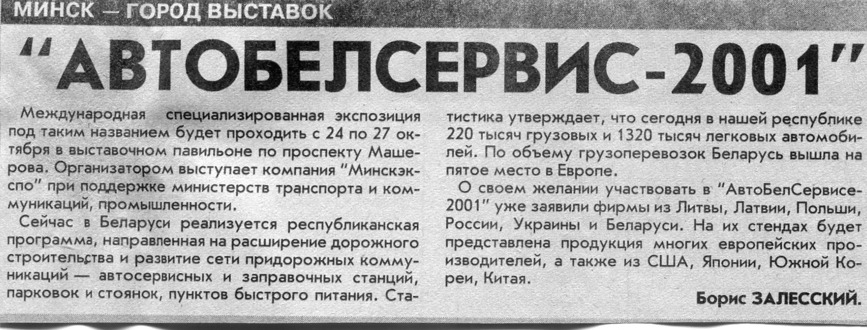Залесский, Б. "Автобелсервис-2001" / Б. Залесский // Вечерний Минск. - 2001. - 24 окт.
