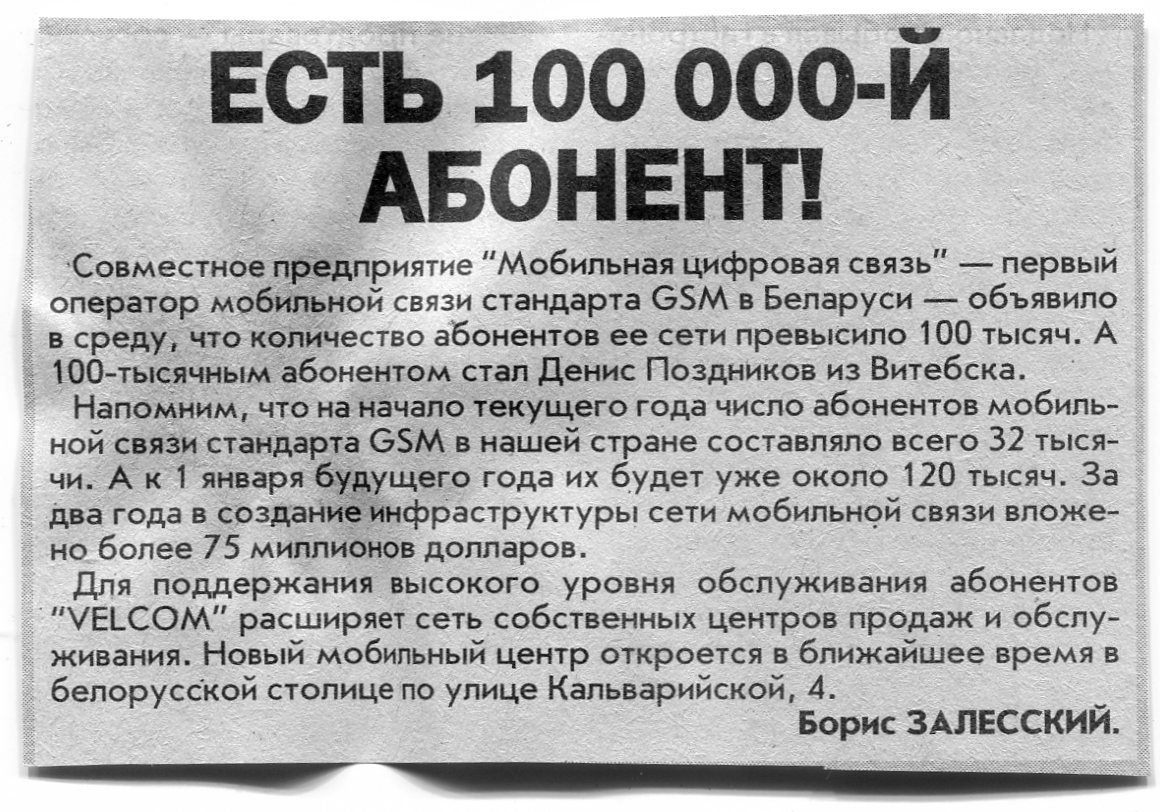 Залесский, Б. Есть 100 000-й абонент! / Б. Залесский // Вечерний Минск. - 2001. - 23 нояб.