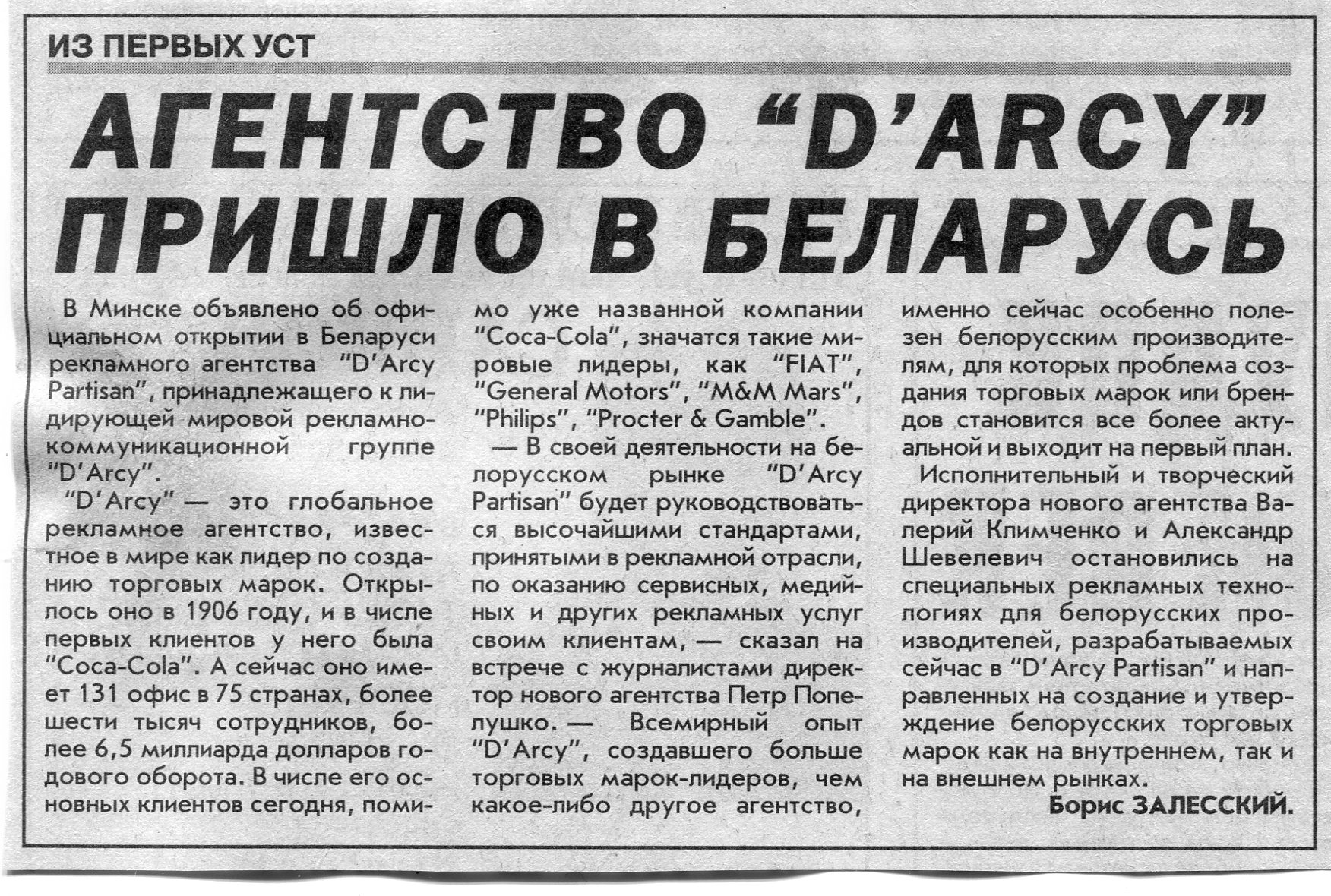 Залесский, Б. Агентство "D`Arcy" пришло в Беларусь / Б. Залесский // Вечерний Минск. - 2001. - 16 мар.