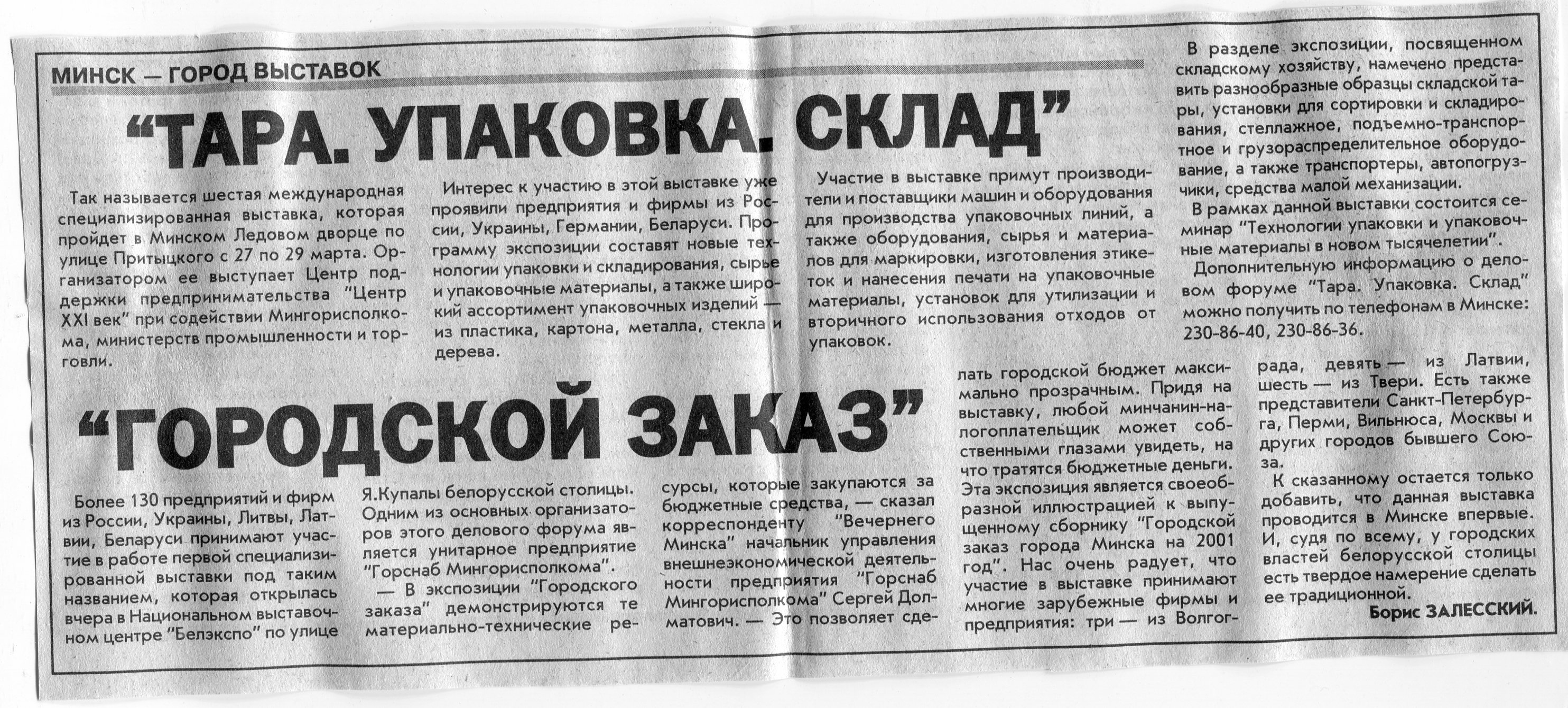 Залесский, Б. "Тара. Упаковка. Склад" / Б. Залесский // Вечерний Минск. - 2001. - 22 мар.