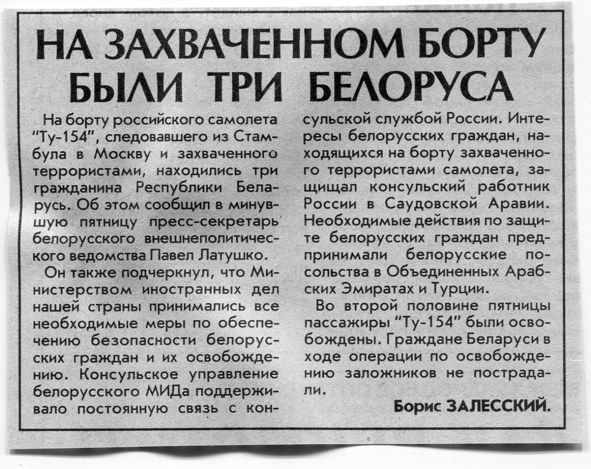 Залесский, Б. На захваченном борту были три белоруса / Б. Залесский // Вечерний Минск. - 2001. - 19 мар.