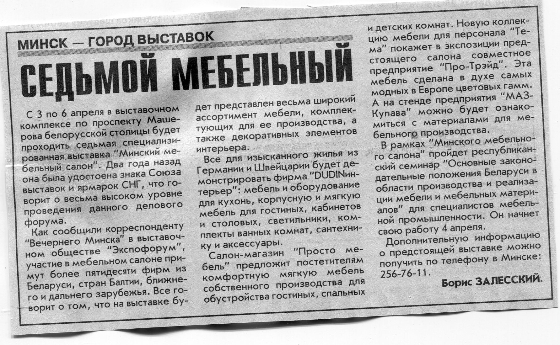 Залесский, Б. Седьмой мебельный / Б. Залесский // Вечерний Минск. - 2001. - 16 мар.