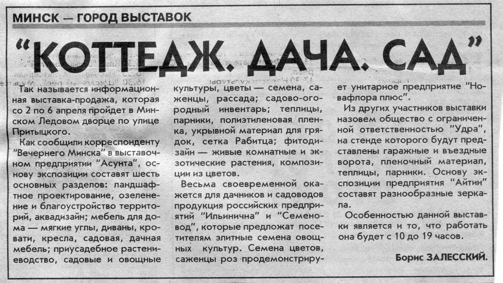Залесский, Б. "Коттедж. Дача. Сад" / Б. Залесский // Вечерний Минск. - 2001. - 30 мар.