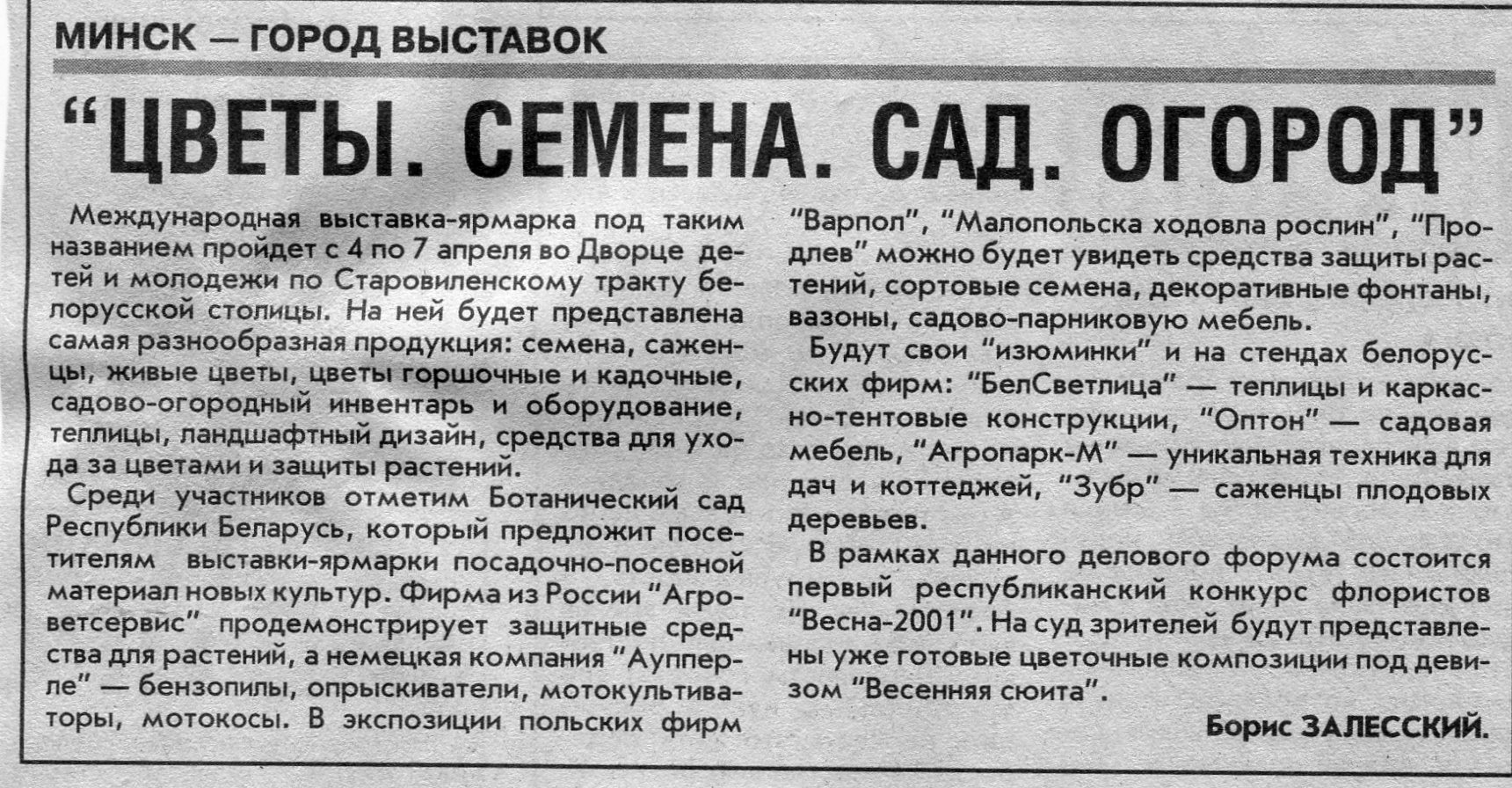 Залесский, Б. "Цветы. Семена. Сад. Огород" / Б. Залесский // Вечерний Минск. - 2001. - 2 апр.