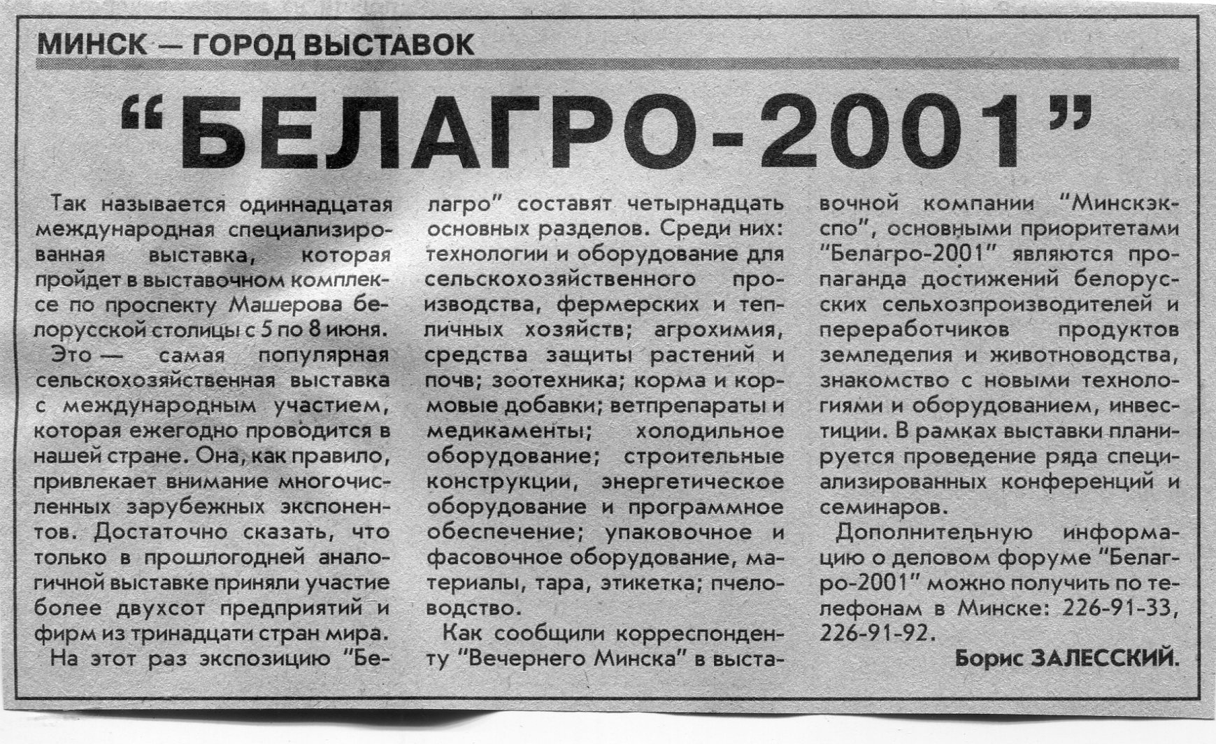 Залесский, Б. "Белагро-2001" / Б. Залесский // Вечерний Минск. - 2001. - 11 апр.