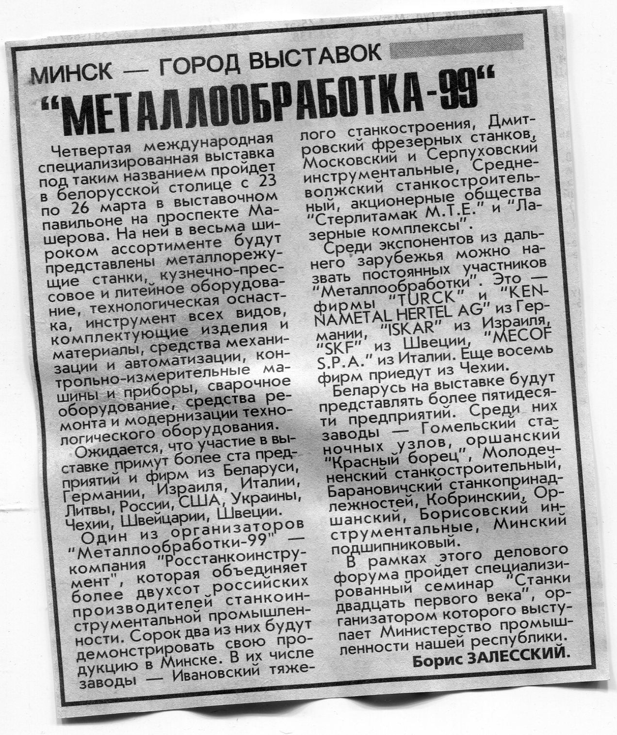 Залесский, Б. "Металлообработка-99" / Б. Залесский // Вечерний Минск. - 1999. - 17 мар.