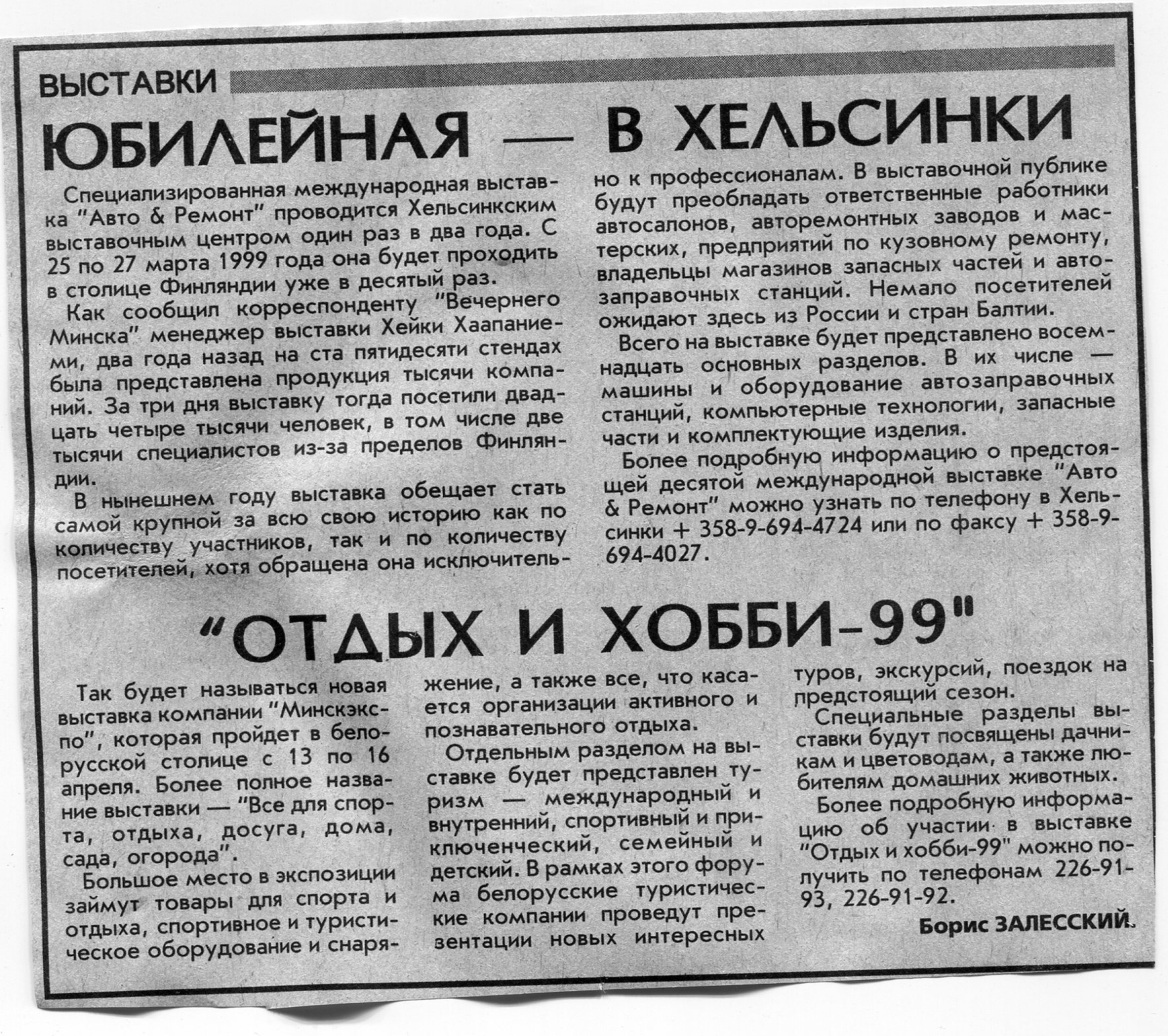 Залесский, Б. "Отдых и хобби-99" / Б. Залесский // Вечерний Минск. - 1999. - 25 мар.