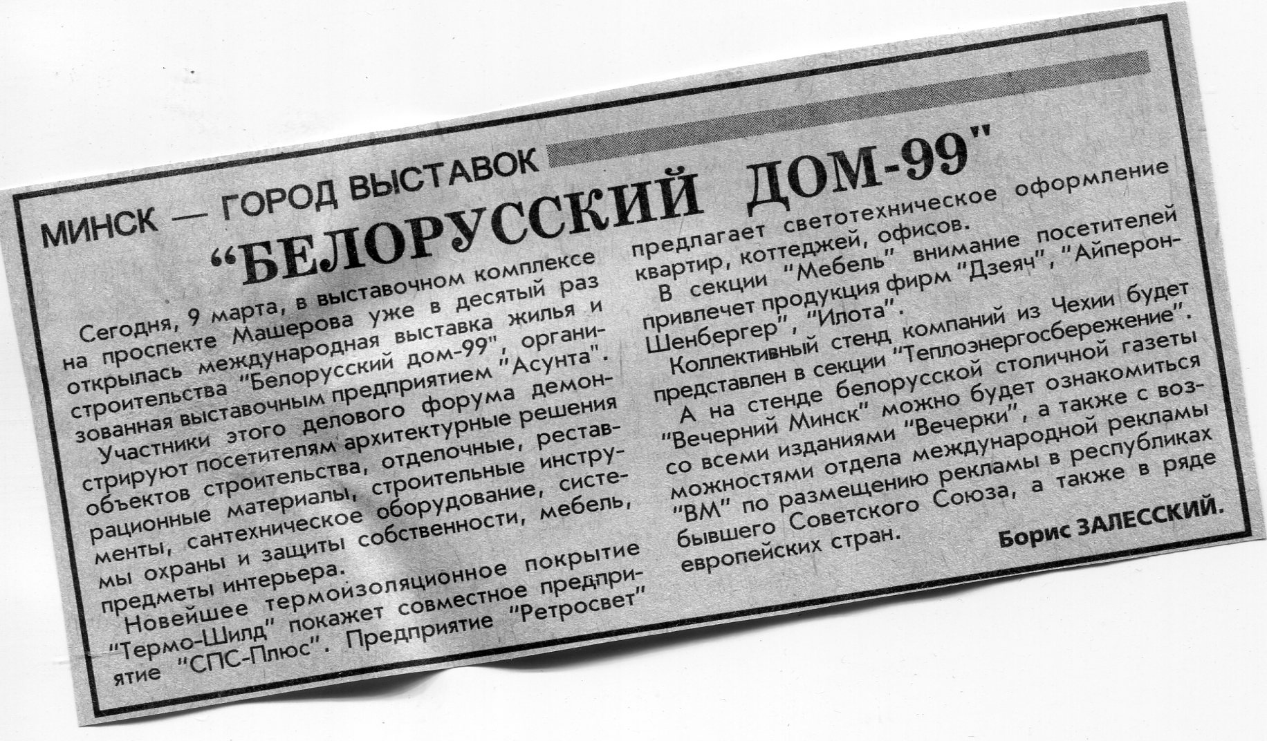 Залесский, Б. "Белорусский дом-99" / Б. Залесский // Вечерний Минск. - 1999. - 9 мар.