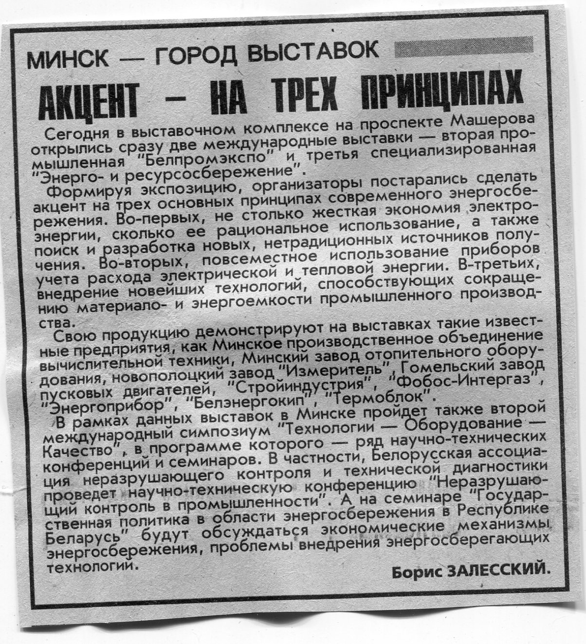 Залесский, Б. Акцент - на трех принципах / Б. Залесский // Вечерний Минск. - 1999. - 25 мая.