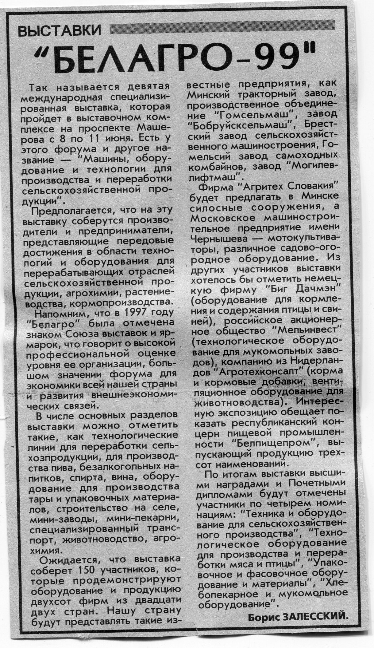 Залесский, Б. "Белагро-99" / Б. Залесский // Вечерний Минск. - 1999. - 4 июн.