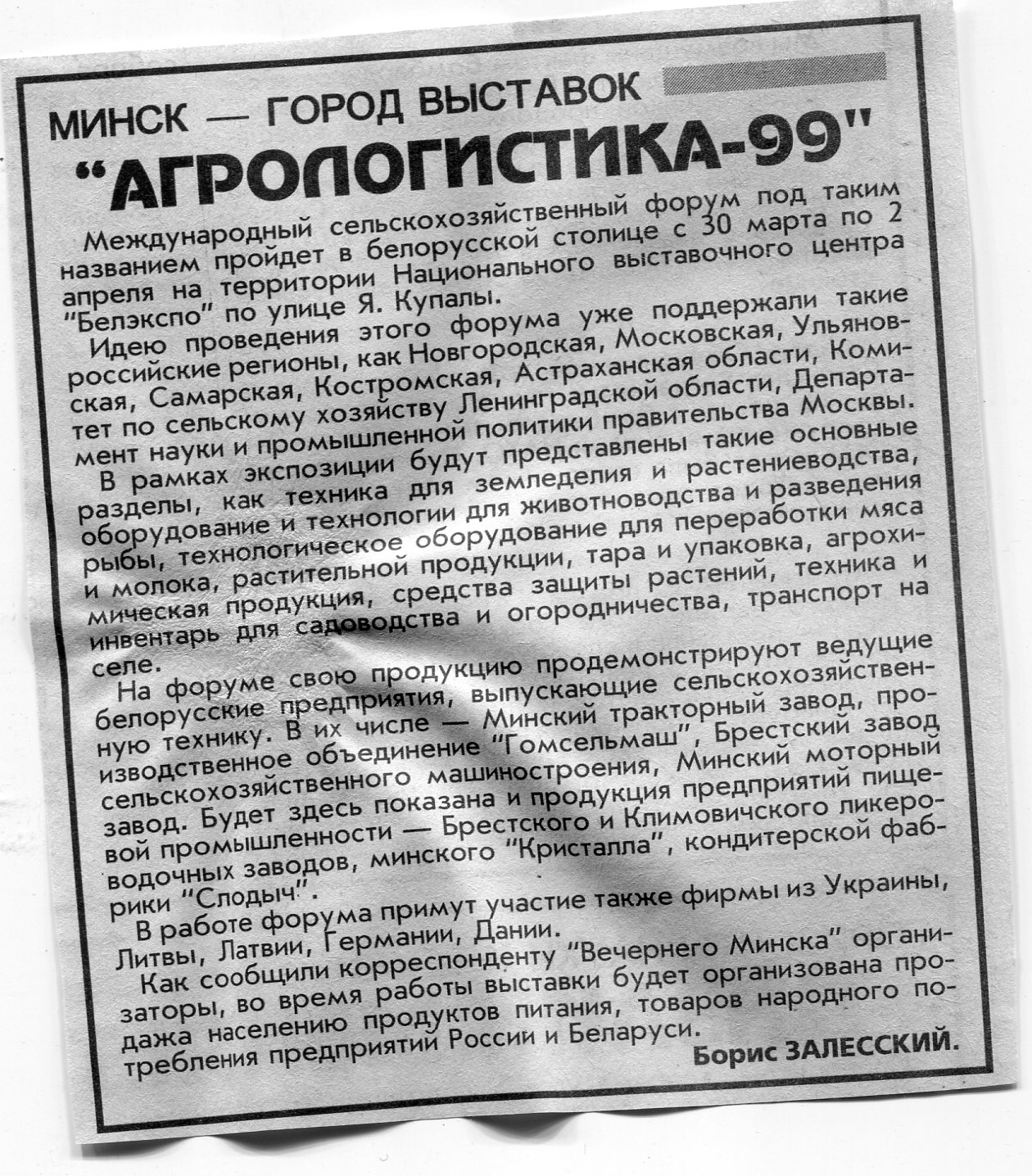 Залесский, Б. "Агрологистика-99" / Б. Залесский // Вечерний Минск. - 1999. - 30 мар.