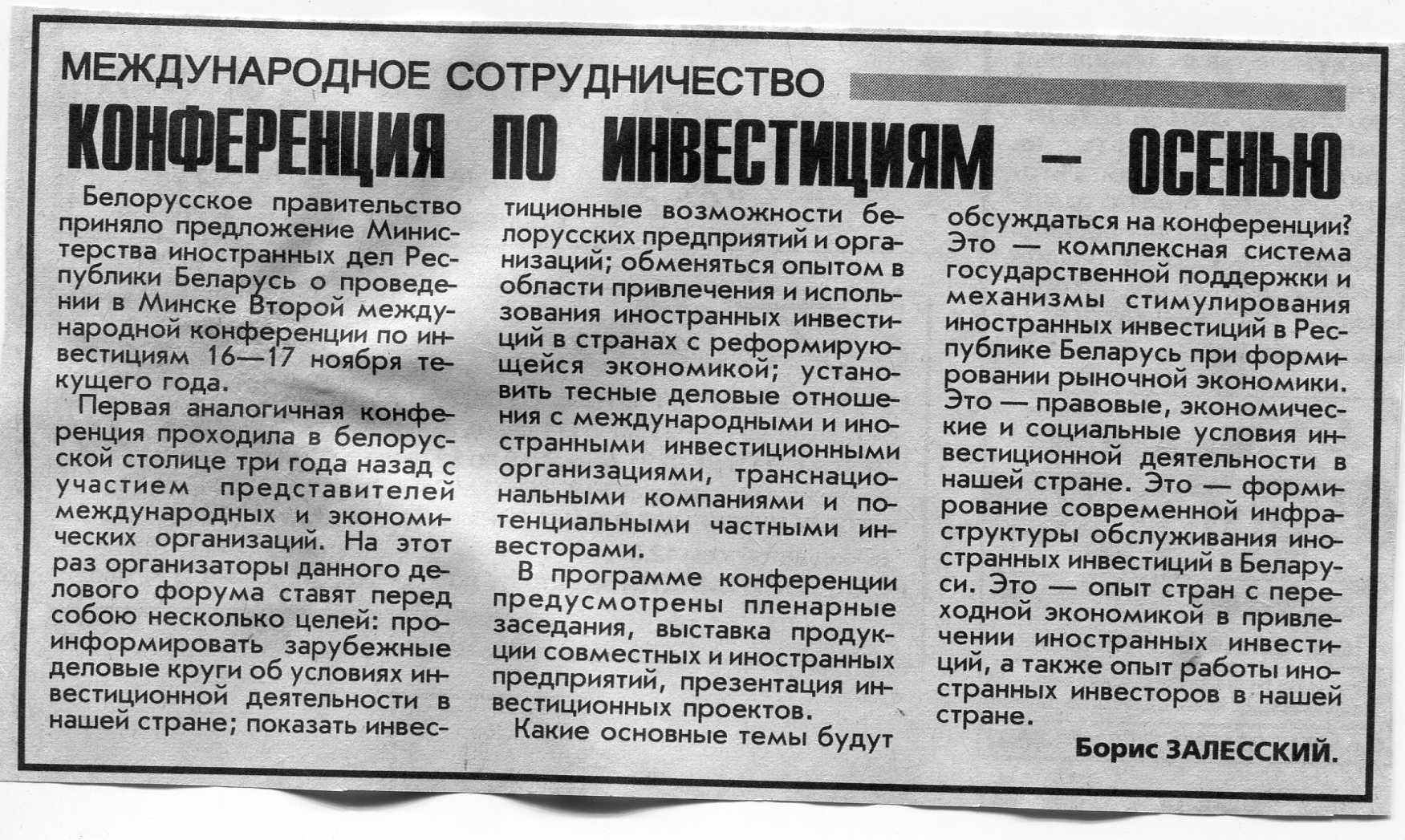 Залесский, Б. Конференция по инвестициям - осенью / Б. Залесский // Вечерний Минск. - 1999. - 30 июн.