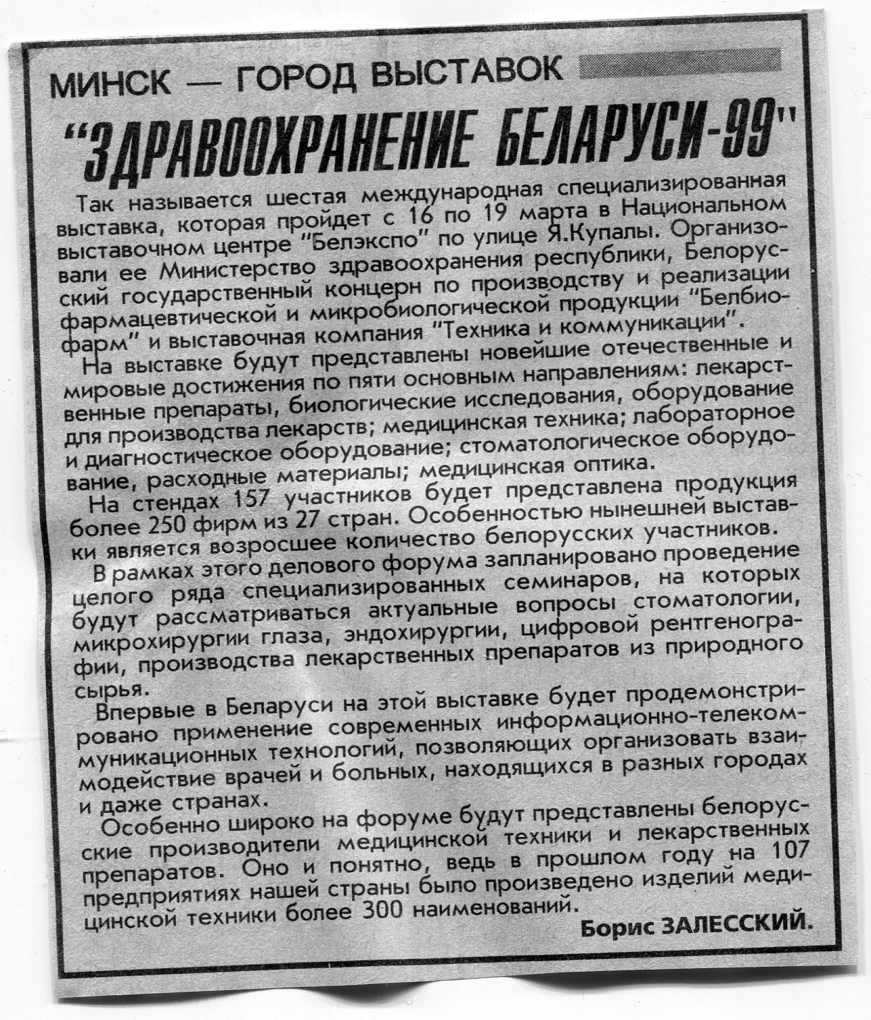 Залесский, Б. "Здравоохранение Беларуси-99" / Б. Залесский // Вечерний Минск. - 1999. - 15 мар.