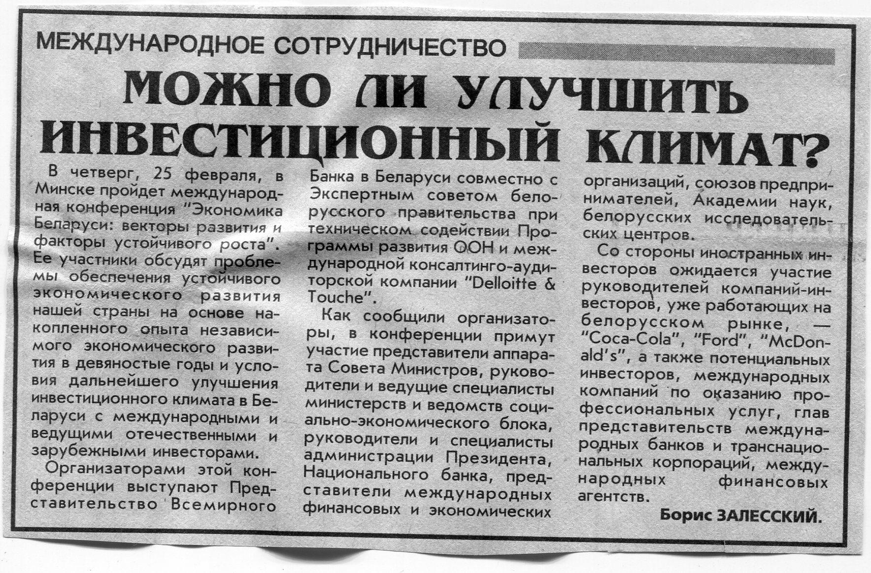 Залесский, Б. Можно ли улучшить инвестиционный климат? / Б. Залесский // Вечерний Минск. - 1999. - 24 февр.