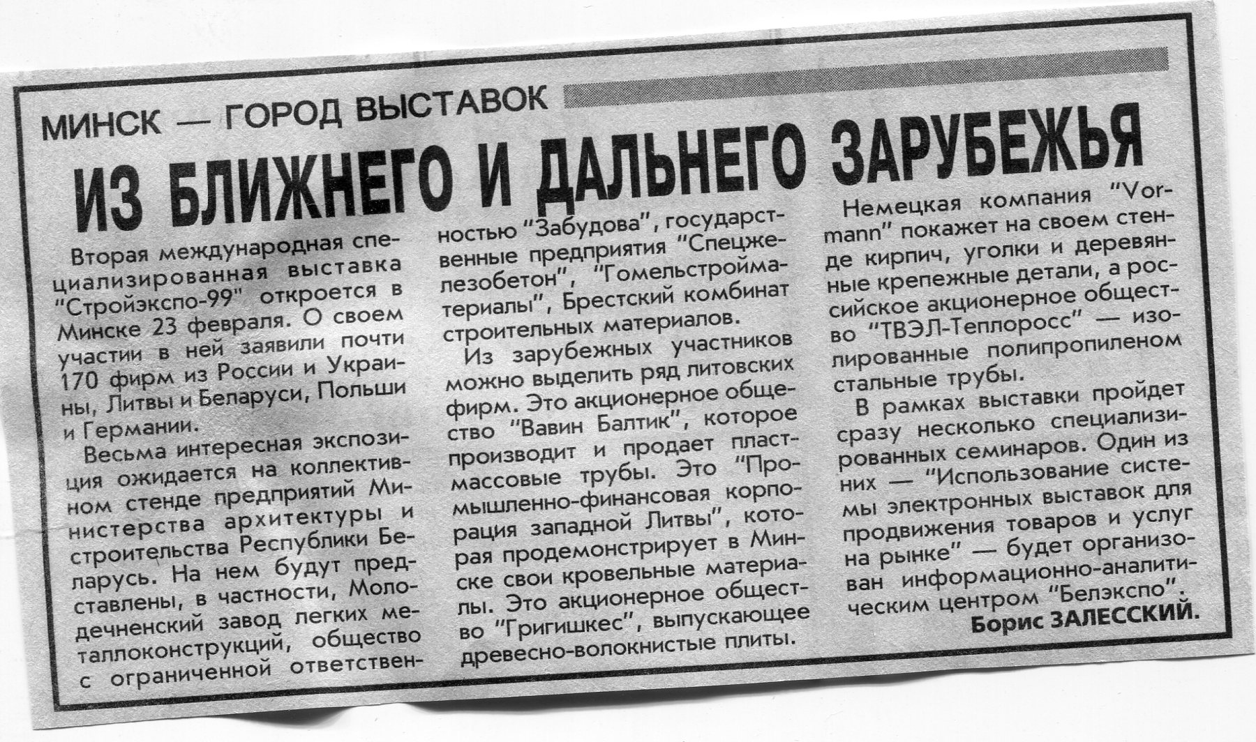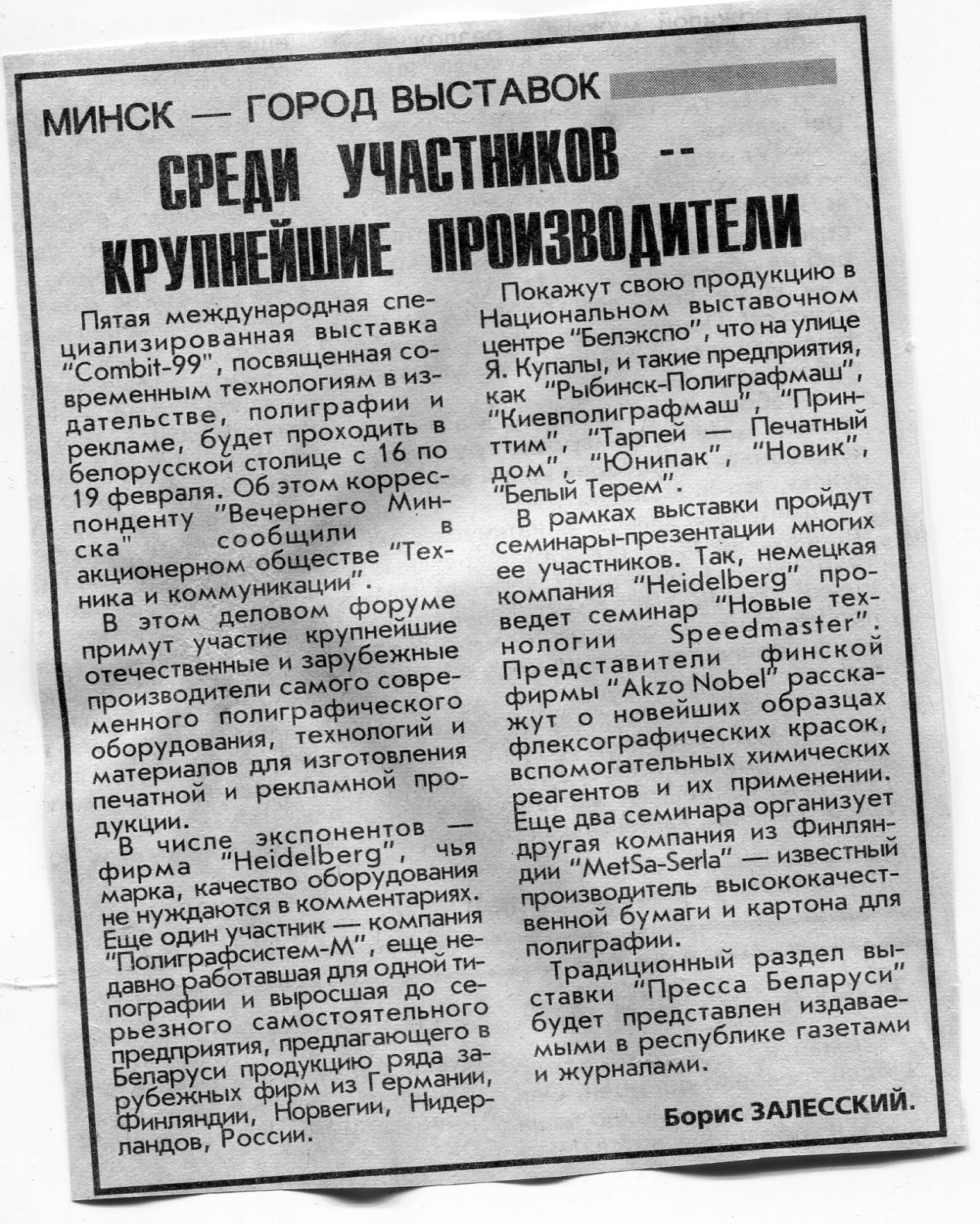 Залесский, Б. Среди участников - крупнейшие производители / Б. Залесский // Вечерний Минск. - 1999. - 10 февр.