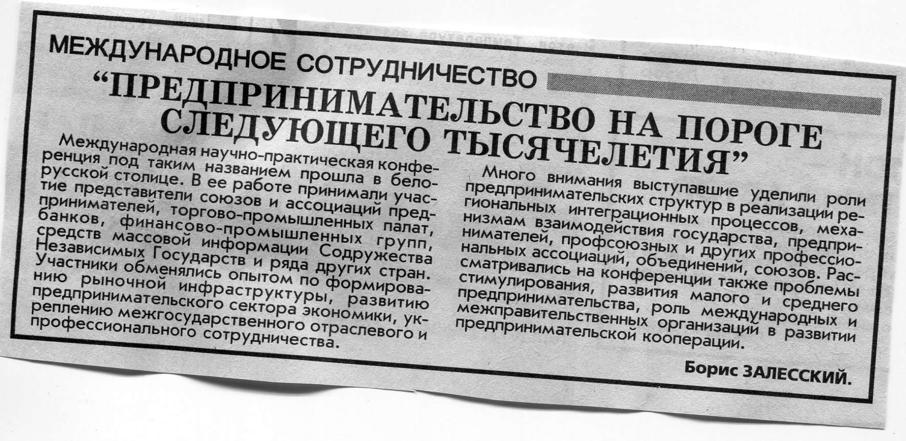 Залесский, Б. "Предпринимательство на пороге следующего тысячелетия" / Б. Залесский // Вечерний Минск. - 1998. - 23 дек.