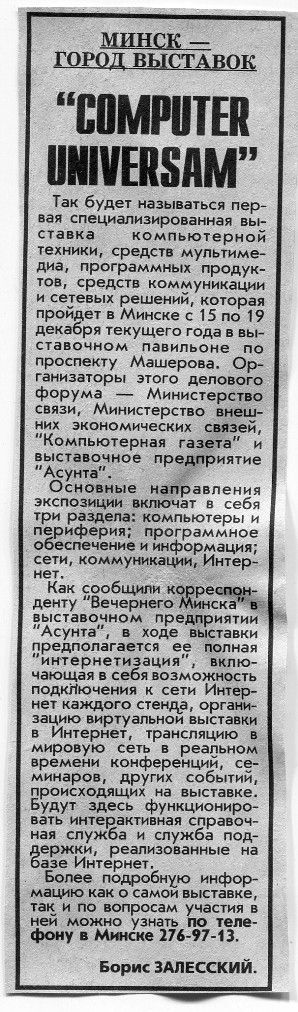 Залесский, Б. "Computer universam" / Б. Залесский // Вечерний Минск. - 1998. - 4 нояб.