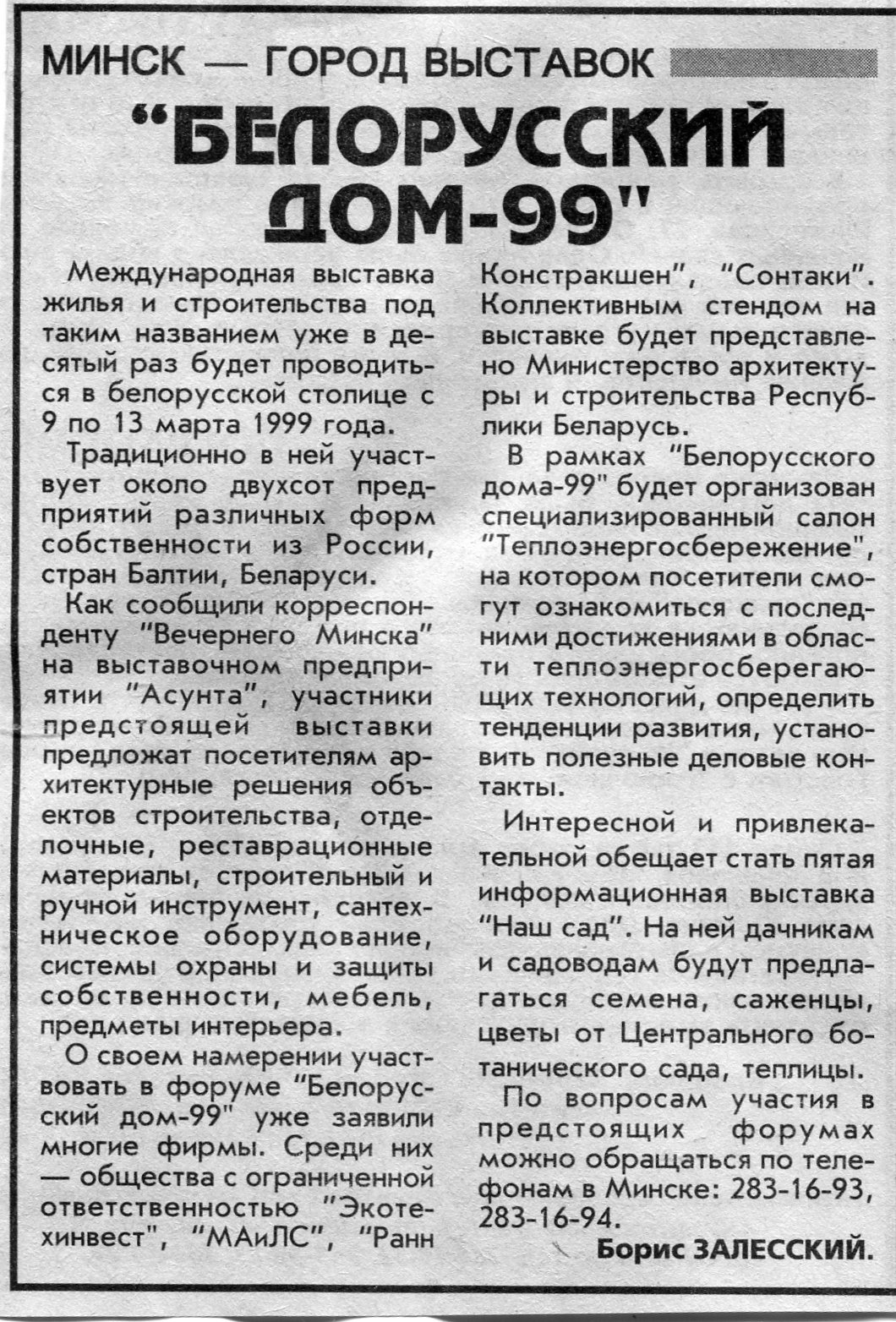 Залесский, Б. "Белорусский дом-99" / Б. Залесский // Вечерний Минск. - 1999. - 5 янв.