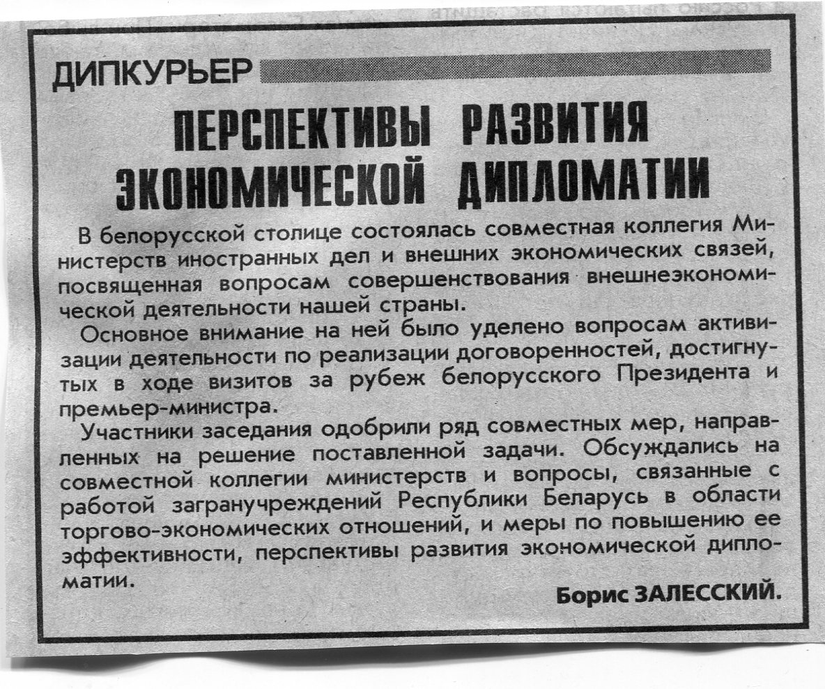 Залесский, Б. Перспективы развития экономической дипломатии / Б. Залесский // Вечерний Минск. - 1998. - 31 авг.