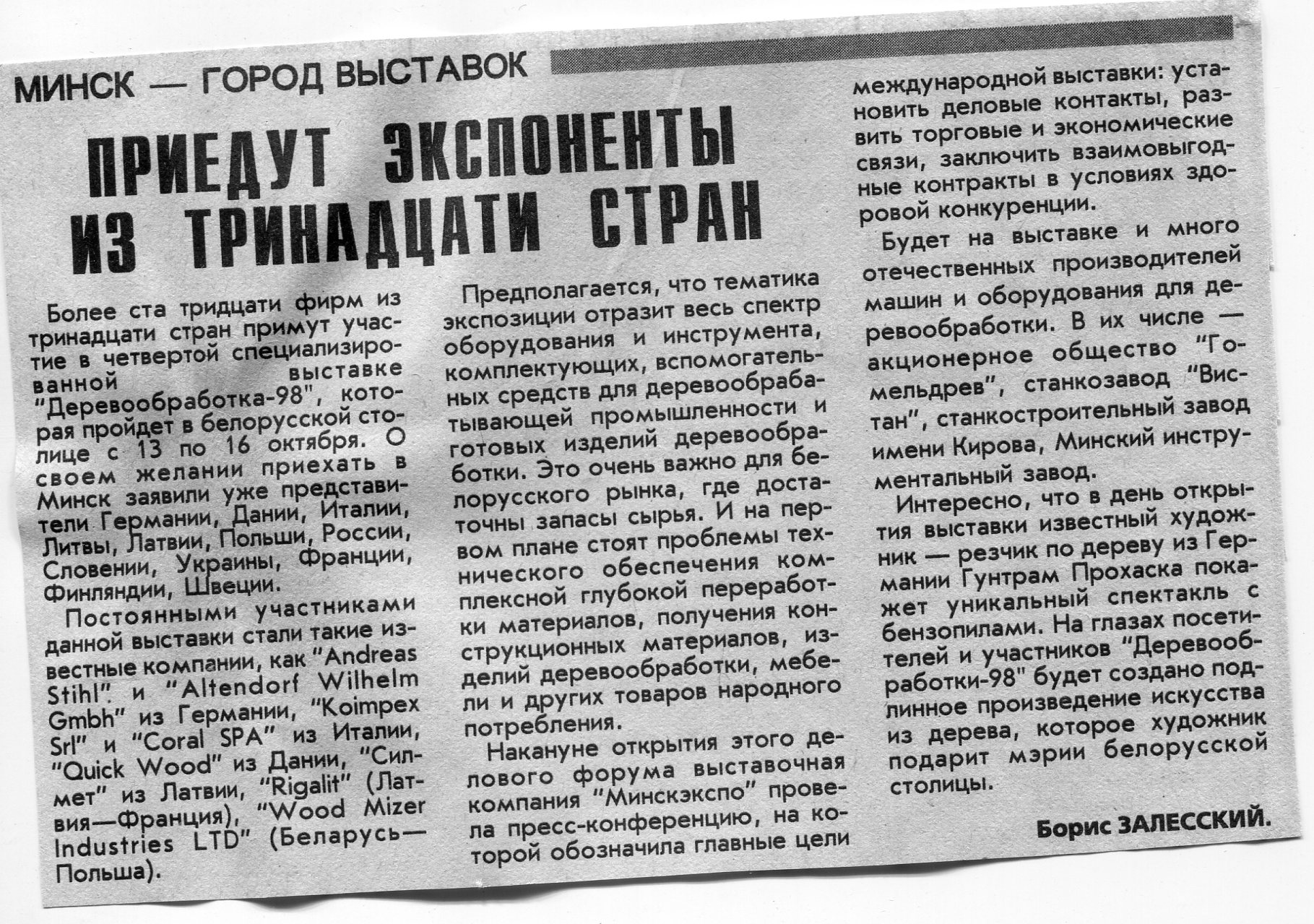Залесский, Б. Приедут экспоненты из тринадцати стран / Б. Залесский // Вечерний Минск. - 1998. - 13 окт.