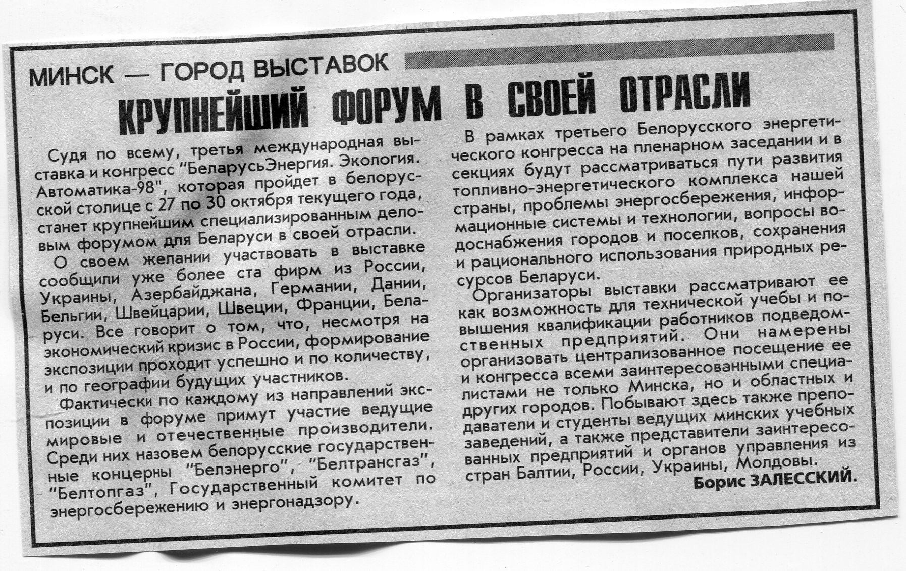 Залесский, Б. Крупнейший форум в своей отрасли / Б. Залесский // Вечерний Минск. - 1998. - 13 окт.