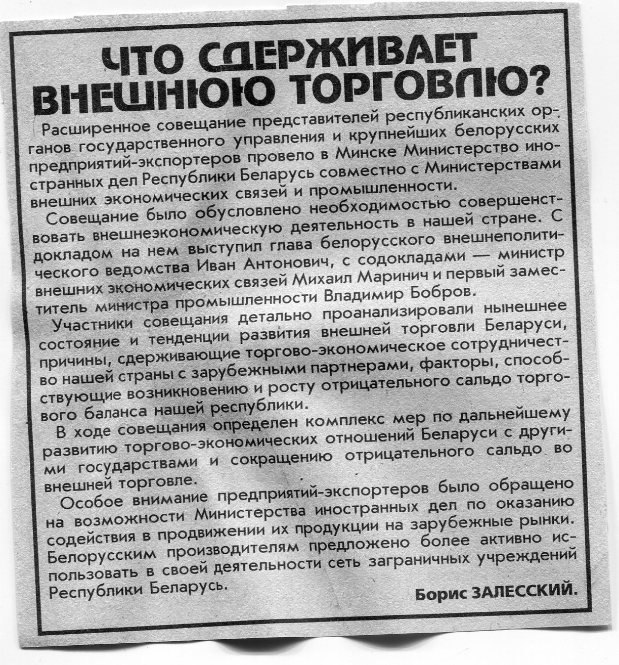 Залесский, Б. Что сдерживает внешнюю торговлю? / Б. Залесский // Вечерний Минск. - 1998. - 16 сент.