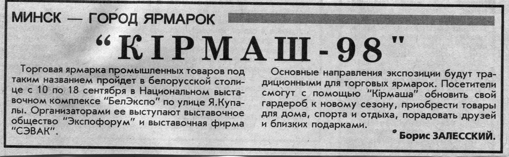 Залесский, Б. "Кірмаш-98" / Б. Залесский // Вечерний Минск. - 1998. - 10 сент.