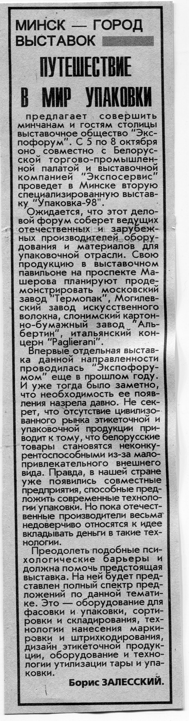 Залесский, Б. Путешествие в мир упаковки / Б. Залесский // Вечерний Минск. - 1998. - 16 сент.