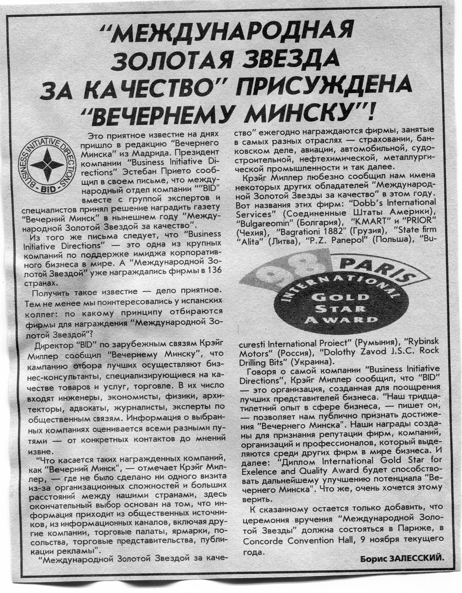 Залесский, Б. "Международная золотая звезда за качество" присуждена "Вечернему Минску"! / Б. Залесский // Вечерний Минск. - 1998. - 25 сент.