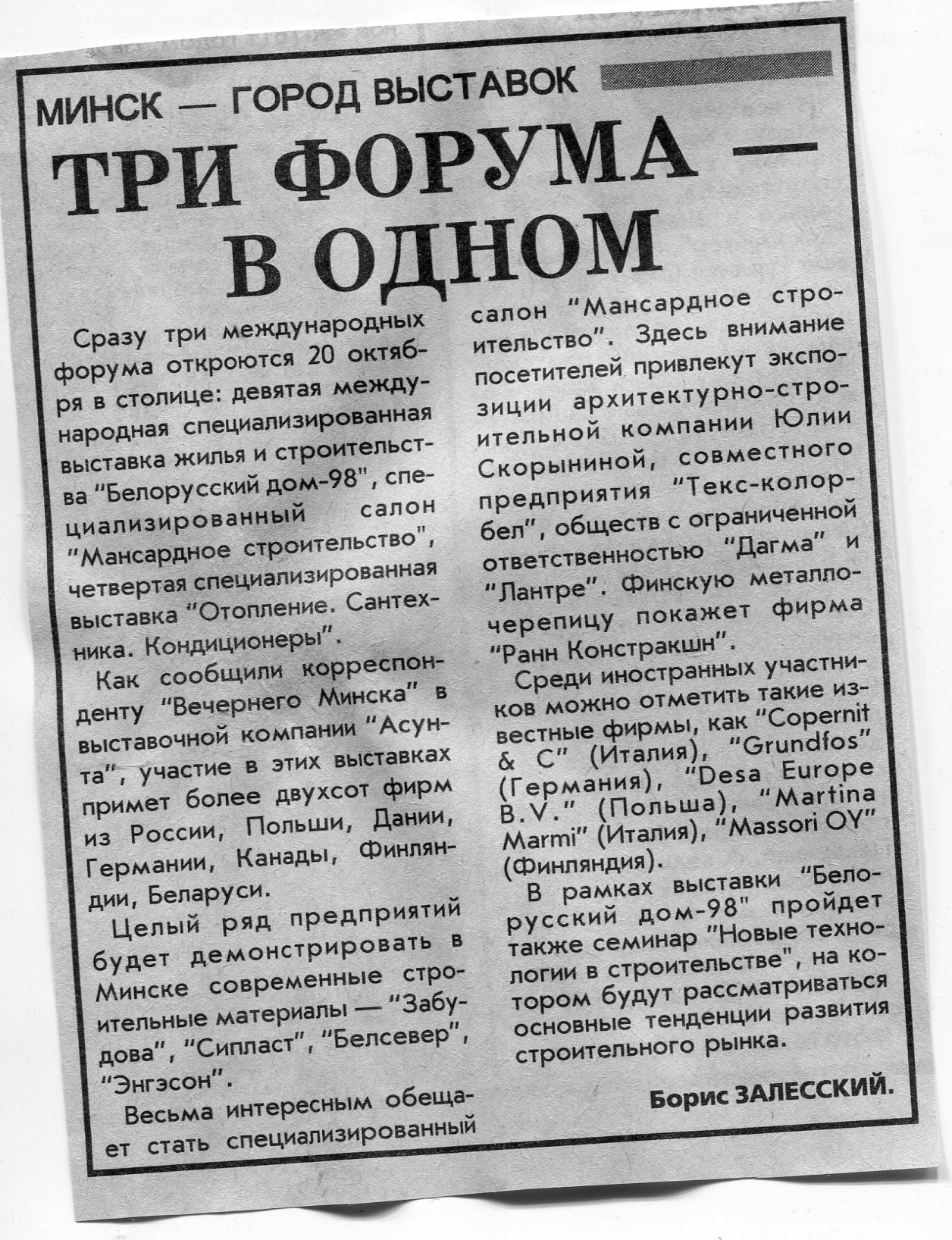 Залесский, Б. Три форума - в одном / Б. Залесский // Вечерний Минск. - 1998. - 15 окт.