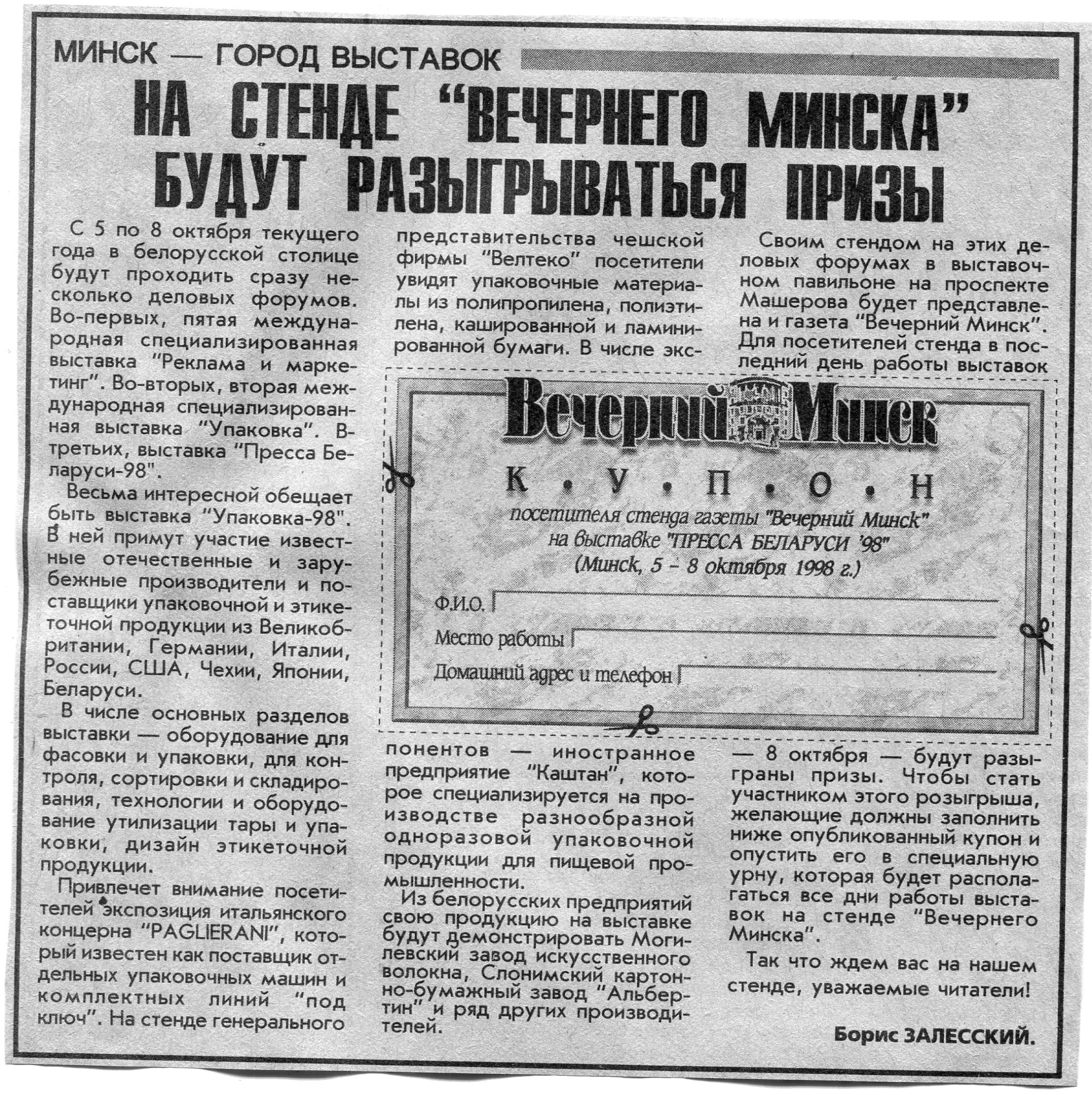 Залесский, Б. Посетители стенда "Вечернего Минска" получат призы / Б. Залесский // Вечерний Минск. - 1998. - 14 окт.