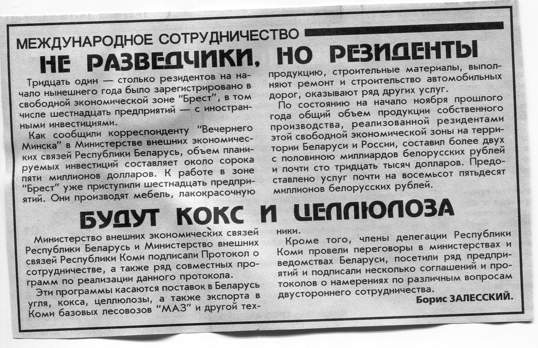 Залесский, Б. Не разведчики, но резиденты / Б. Залесский // Вечерний Минск. - 1998. - 21 янв.