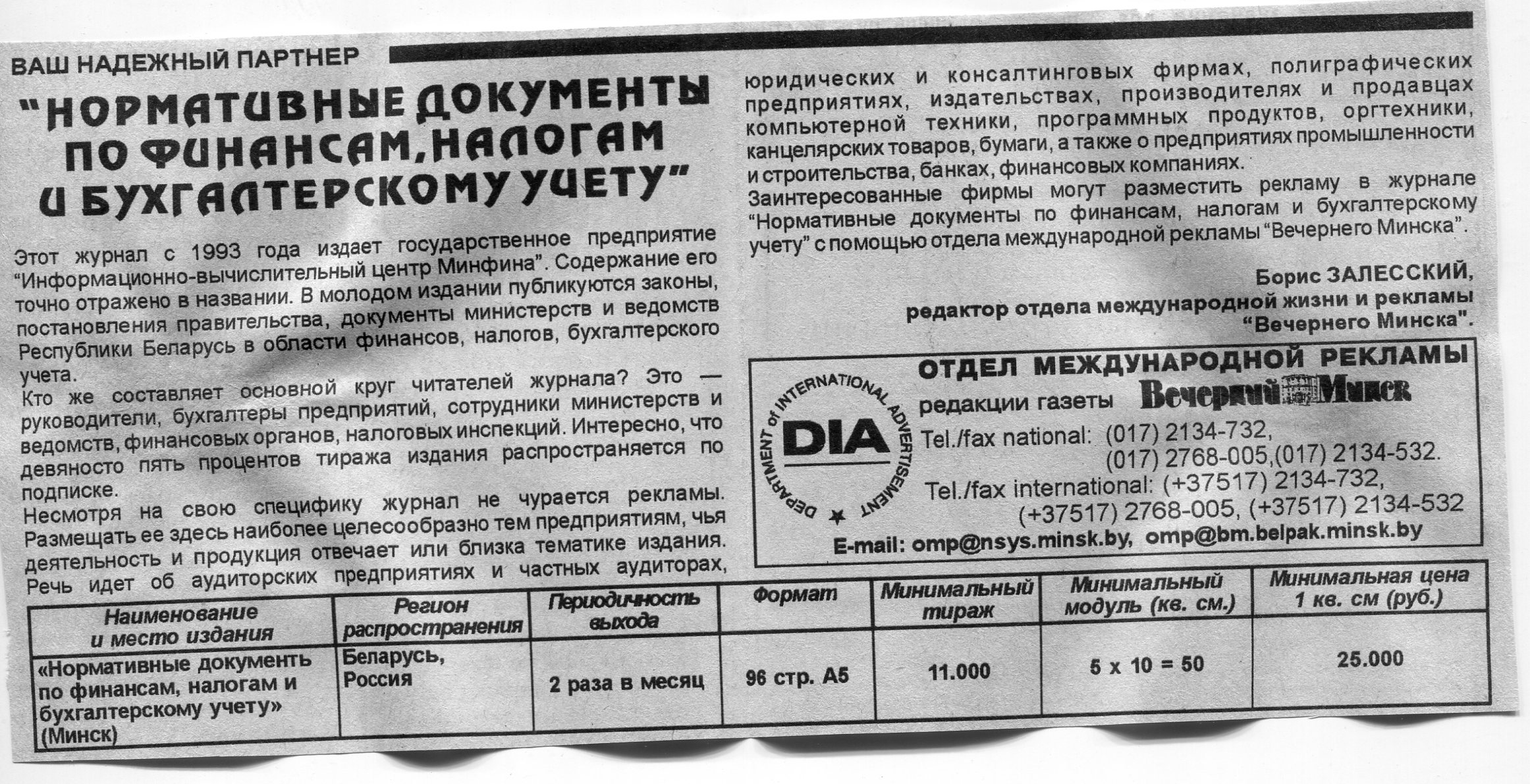 Залесский, Б. "Нормативные документы по финансам, налогам и бухгалтерскому учету" / Б. Залесский // Вечерний Минск. – 1998. – 2 апр.